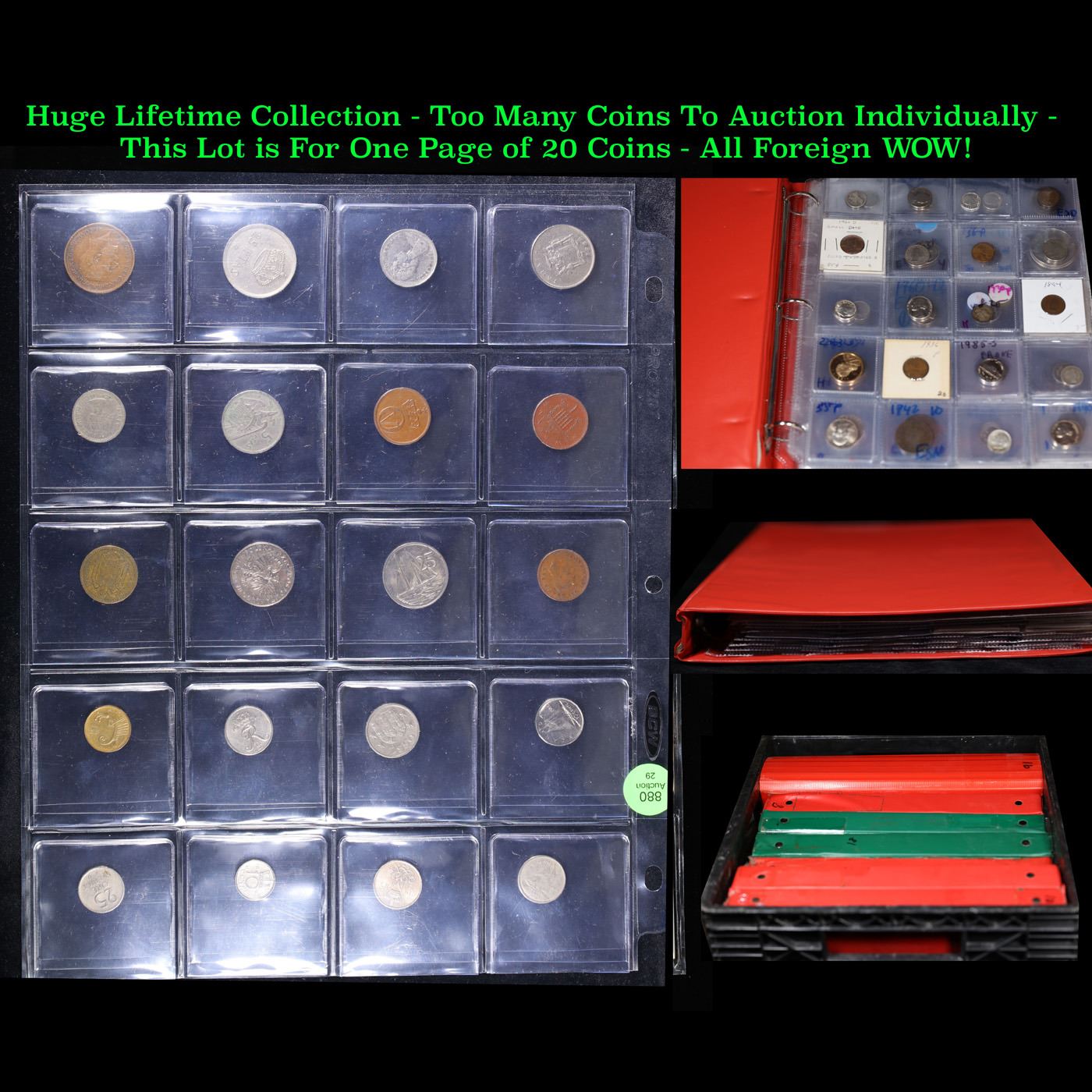 Huge Liifetime Collection - Too Many Coins To Auction Individually - This Lot is For One Page of 20 Foreign Coins. We have received a huge collection of over 10 thousand US coins in flips, 2x2 holders, and 20 coin pages. We are forced, due to limited lots, to sell this collection in pages of 20 coins. All of the pages include Silver Coins. Most contain Indian Cents, Proof Coins, Barber Coinage, Bust Coinage, Lincoln Cents, Flying Eagles, Jefferson Nickels, Roosevelt Dimes, Buffalo Nickels, Eisenhower Dollars, Kennedy Halves, Large Cents including some Draped Bust Large Cents, Mercury Dimes, and Liberty V Nickels. These pages could not be reviewed by anyone in our office due to time constraints. We estimate the value of each page to meet or exceed $200 in value! Good luck and happy hunting.