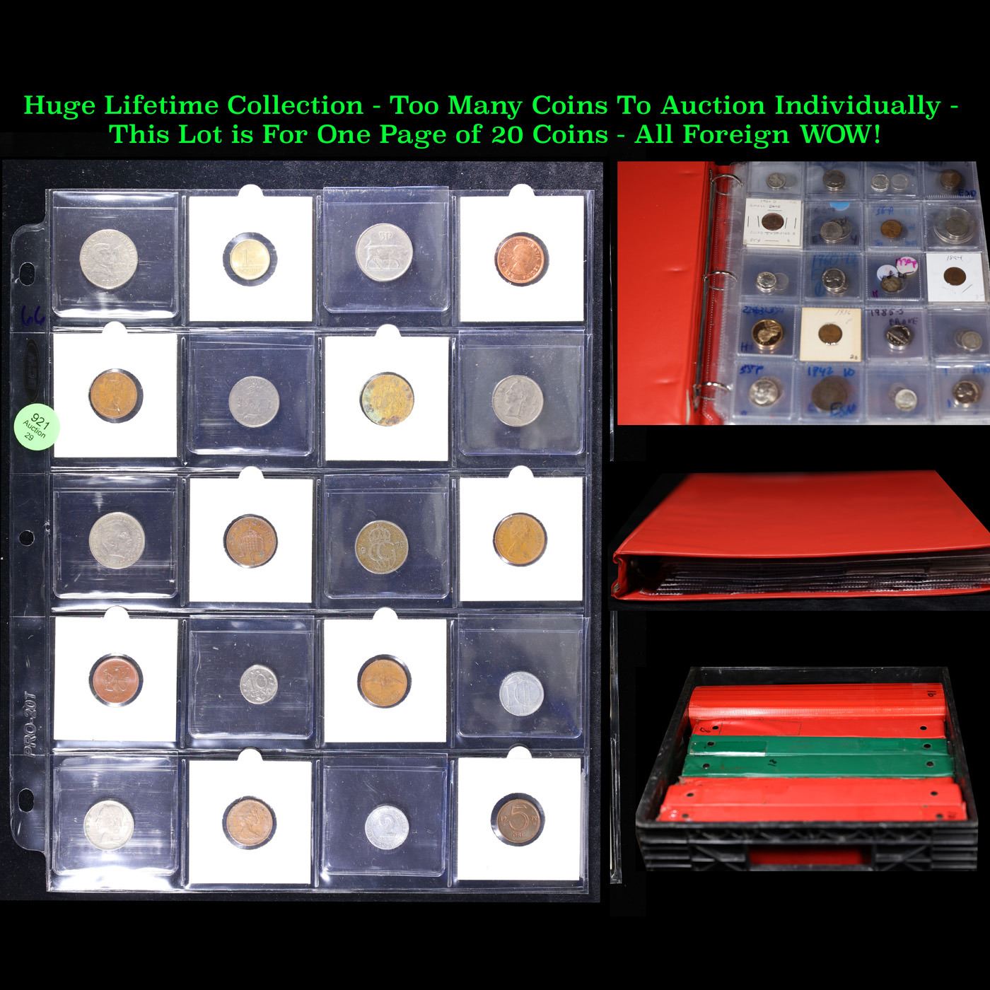 Huge Liifetime Collection - Too Many Coins To Auction Individually - This Lot is For One Page of 20 Foreign Coins. We have received a huge collection of over 10 thousand US coins in flips, 2x2 holders, and 20 coin pages. We are forced, due to limited lots, to sell this collection in pages of 20 coins. All of the pages include Silver Coins. Most contain Indian Cents, Proof Coins, Barber Coinage, Bust Coinage, Lincoln Cents, Flying Eagles, Jefferson Nickels, Roosevelt Dimes, Buffalo Nickels, Eisenhower Dollars, Kennedy Halves, Large Cents including some Draped Bust Large Cents, Mercury Dimes, and Liberty V Nickels. These pages could not be reviewed by anyone in our office due to time constraints. We estimate the value of each page to meet or exceed $200 in value! Good luck and happy hunting.