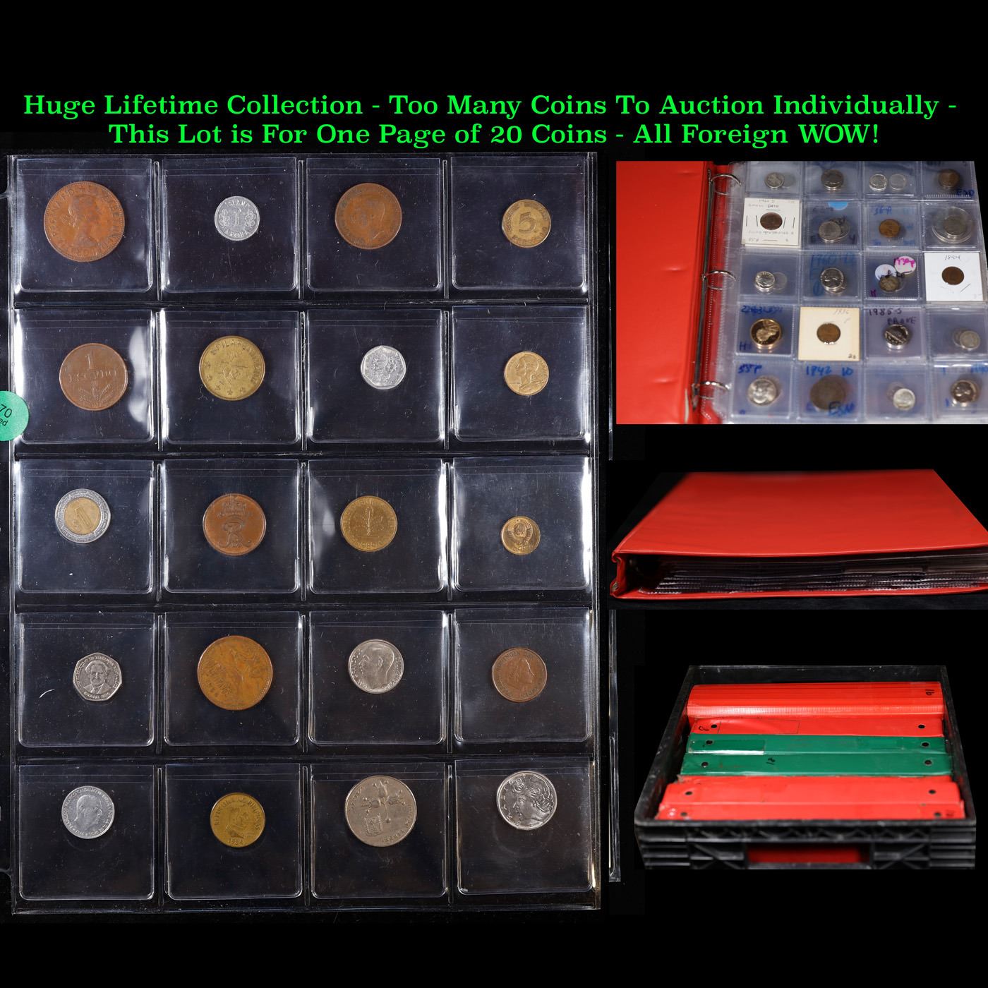 Huge Liifetime Collection - Too Many Coins To Auction Individually - This Lot is For One Page of 20 Foreign Coins. We have received a huge collection of over 10 thousand US coins in flips, 2x2 holders, and 20 coin pages. We are forced, due to limited lots, to sell this collection in pages of 20 coins. All of the pages include Silver Coins. Most contain Indian Cents, Proof Coins, Barber Coinage, Bust Coinage, Lincoln Cents, Flying Eagles, Jefferson Nickels, Roosevelt Dimes, Buffalo Nickels, Eisenhower Dollars, Kennedy Halves, Large Cents including some Draped Bust Large Cents, Mercury Dimes, and Liberty V Nickels. These pages could not be reviewed by anyone in our office due to time constraints. We estimate the value of each page to meet or exceed $200 in value! Good luck and happy hunting.