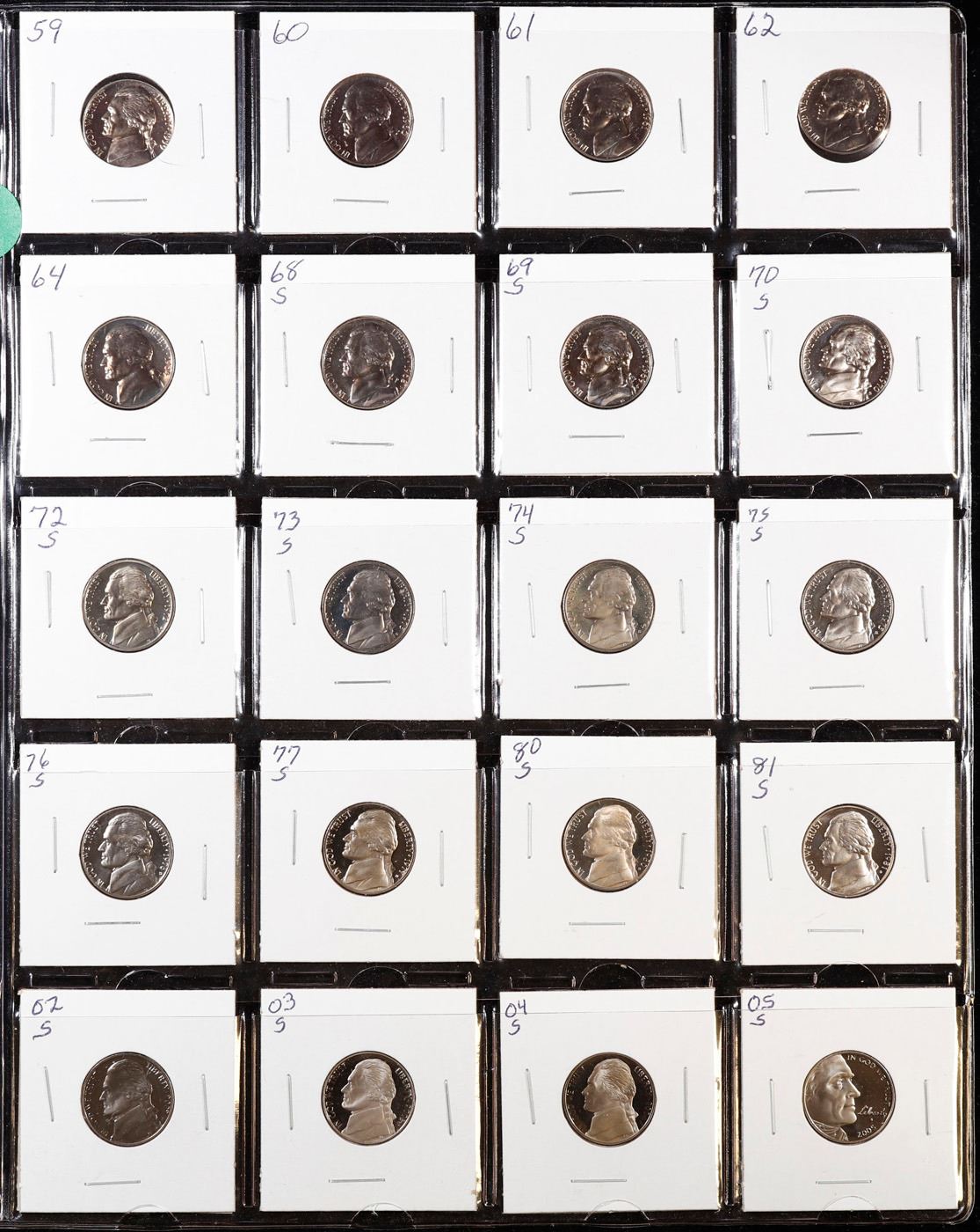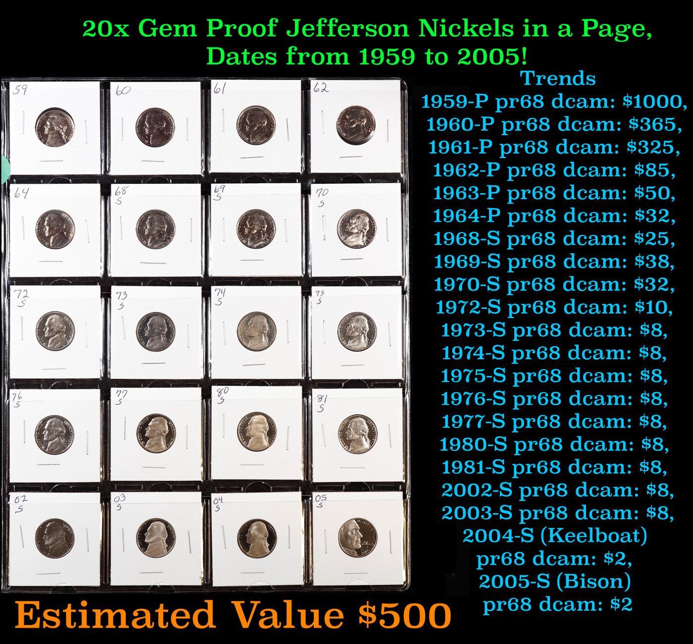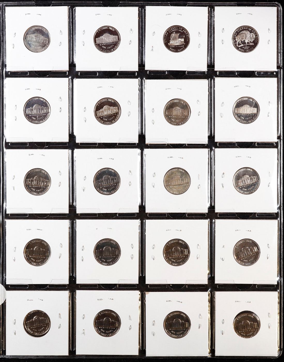 Huge Liifetime Collection - Too Many Coins To Auction Individually - This Lot is For One Page of 20 Proof Jefferson Nickels Dates Range From 1971-2006. We have received a huge collection of over 10 thousand US coins in flips, 2x2 holders, and 20 coin pages. We are forced, due to limited lots, to sell this collection in pages of 20 coins. This Page is For 20 Proof Jefferson Nickels. Trends 1987-s pr69 DCAM $15, 1980-s pr69 DCAM $10, 2006-s pr69 DCAM $15, 1985-s pr69 DCAM $15, 1972-s pr69 DCAM $36, 2002-s pr69 DCAM $15, 1971-s pr69 DCAM $200, 2006-s pr69 DCAM $15, 1981-s pr69 DCAM $20, 1983-s pr69 DCAM $15, 1992-s pr69 DCAM $15, 1992-s pr69 DCAM $15, 1980-s pr69 DCAM $10, 1980-s pr69 DCAM $10, 2001-s pr69 DCAM $15, 1981-s pr69 DCAM $20, 1993-s pr69 DCAM $15, 1985-s pr69 DCAM $15, 1991-s pr69 DCAM $15, 1980-s pr69 DCAM $10. We estimate the value of each page to meet or exceed $200 in value! Good luck and happy hunting.