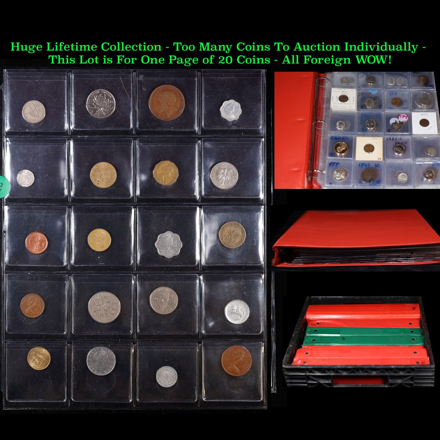 Huge Liifetime Collection - Too Many Coins To Auction Individually - This Lot is For One Page of 20 Foreign Coins. We have received a huge collection of over 10 thousand US coins in flips, 2x2 holders, and 20 coin pages. We are forced, due to limited lots, to sell this collection in pages of 20 coins. All of the pages include Silver Coins. Most contain Indian Cents, Proof Coins, Barber Coinage, Bust Coinage, Lincoln Cents, Flying Eagles, Jefferson Nickels, Roosevelt Dimes, Buffalo Nickels, Eisenhower Dollars, Kennedy Halves, Large Cents including some Draped Bust Large Cents, Mercury Dimes, and Liberty V Nickels. These pages could not be reviewed by anyone in our office due to time constraints. We estimate the value of each page to meet or exceed $200 in value! Good luck and happy hunting.