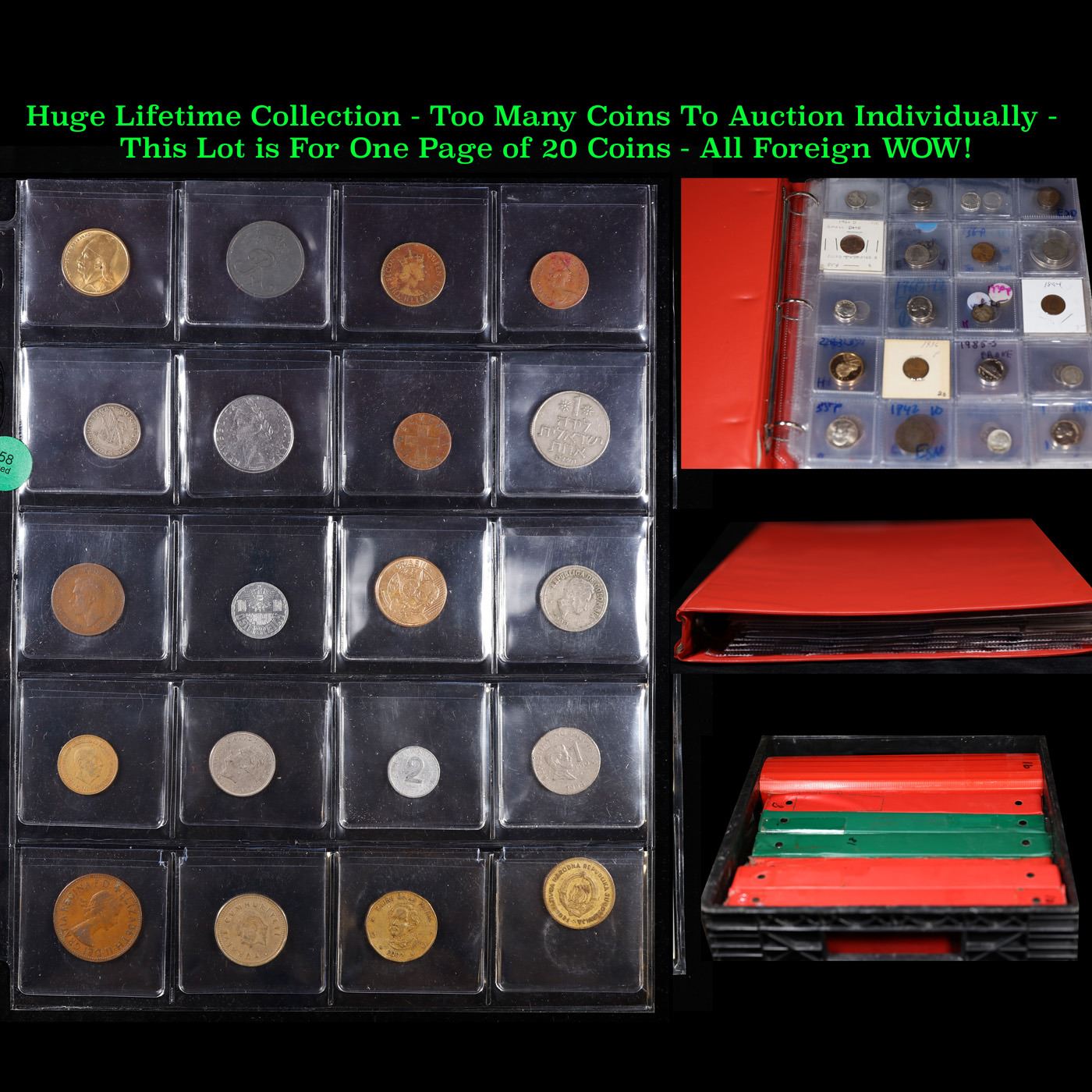 Huge Liifetime Collection - Too Many Coins To Auction Individually - This Lot is For One Page of 20 Foreign Coins. We have received a huge collection of over 10 thousand US coins in flips, 2x2 holders, and 20 coin pages. We are forced, due to limited lots, to sell this collection in pages of 20 coins. All of the pages include Silver Coins. Most contain Indian Cents, Proof Coins, Barber Coinage, Bust Coinage, Lincoln Cents, Flying Eagles, Jefferson Nickels, Roosevelt Dimes, Buffalo Nickels, Eisenhower Dollars, Kennedy Halves, Large Cents including some Draped Bust Large Cents, Mercury Dimes, and Liberty V Nickels. These pages could not be reviewed by anyone in our office due to time constraints. We estimate the value of each page to meet or exceed $200 in value! Good luck and happy hunting.