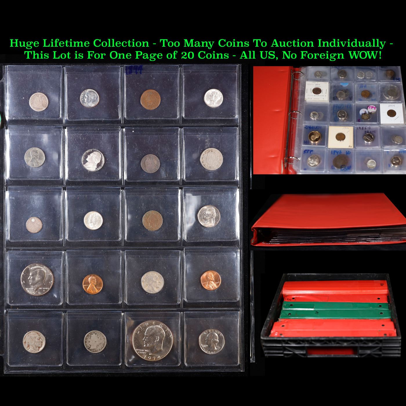 Huge Liifetime Collection - Too Many Coins To Auction Individually - This Lot is For One Page of 20 Coins - All US, No Foreign WOW!. We have received a huge collection of over 10 thousand US coins in flips, 2x2 holders, and 20 coin pages. We are forced, due to limited lots, to sell this collection in pages of 20 coins. All of the pages include Silver Coins. Most contain Indian Cents, Proof Coins, Barber Coinage, Bust Coinage, Lincoln Cents, Flying Eagles, Jefferson Nickels, Roosevelt Dimes, Buffalo Nickels, Eisenhower Dollars, Kennedy Halves, Large Cents including some Draped Bust Large Cents, Mercury Dimes, and Liberty V Nickels. These pages could not be reviewed by anyone in our office due to time constraints. We estimate the value of each page to meet or exceed $200 in value! Good luck and happy hunting.