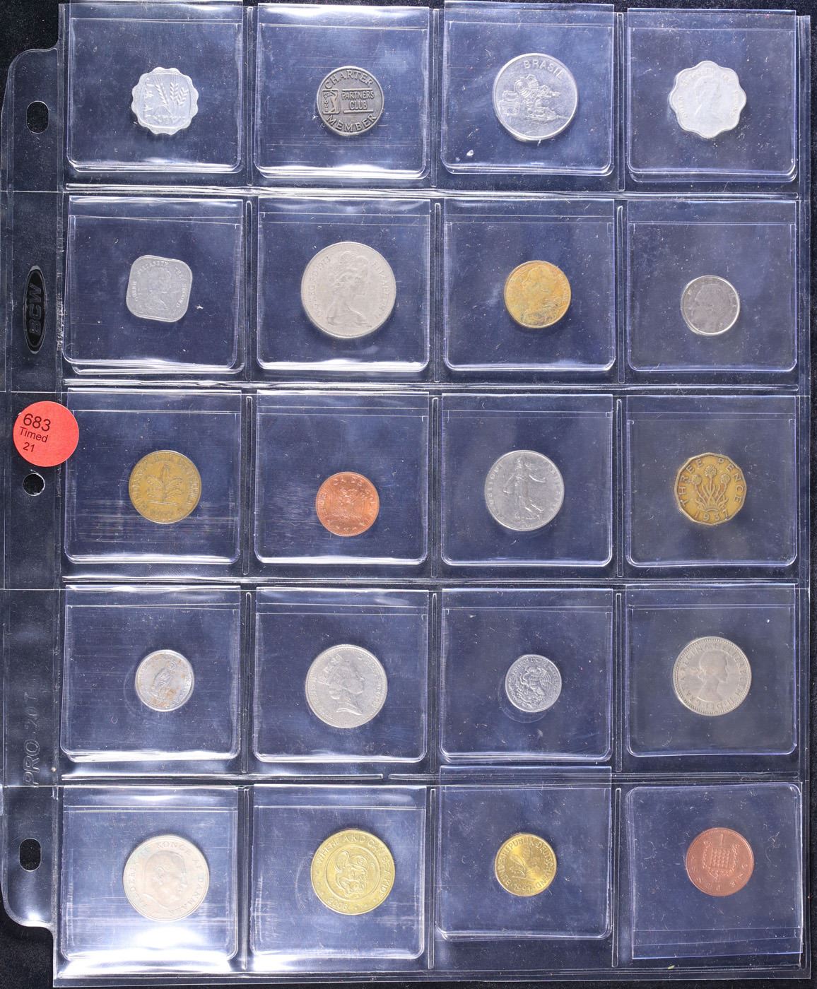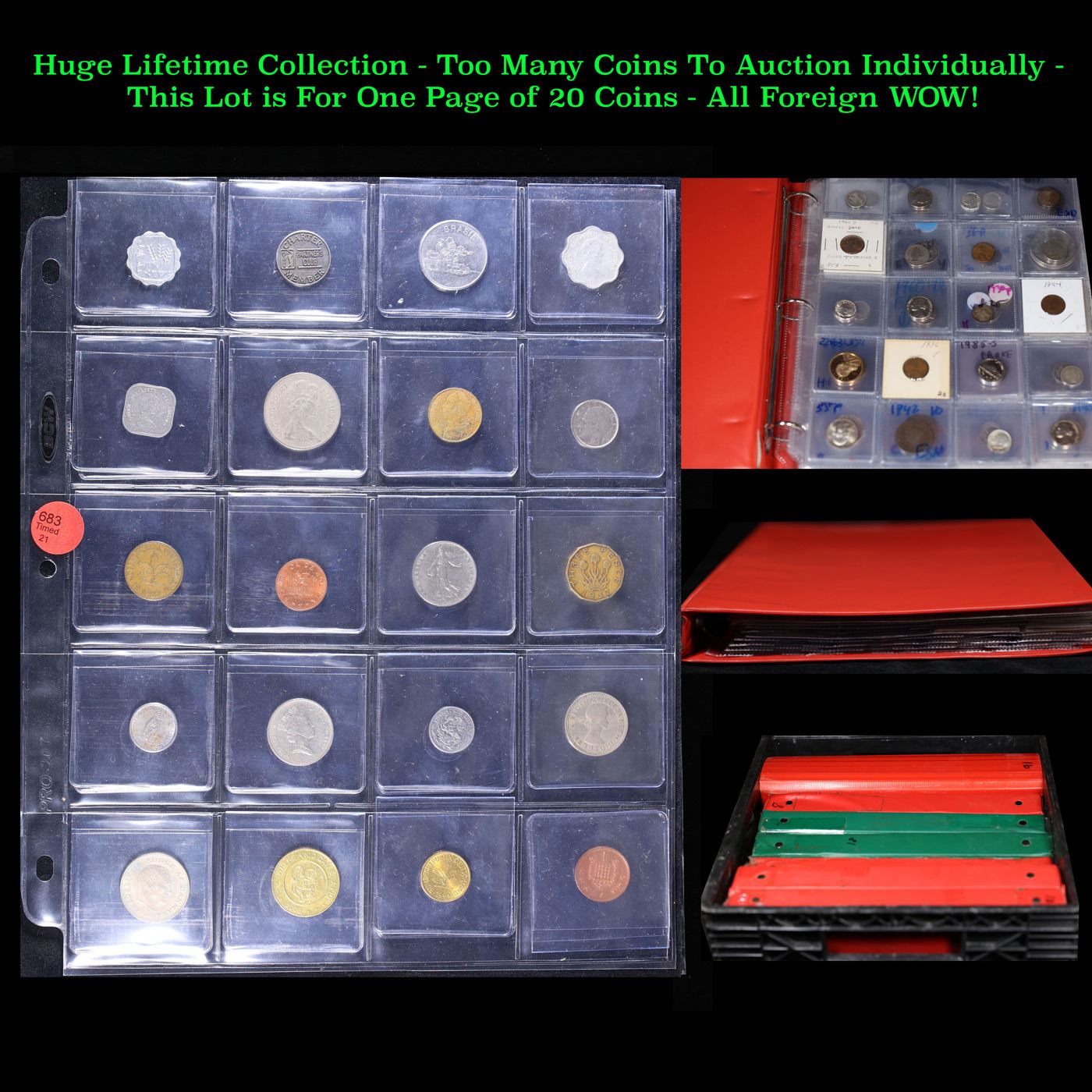 Huge Liifetime Collection - Too Many Coins To Auction Individually - This Lot is For One Page of 20 Foreign Coins. We have received a huge collection of over 10 thousand US coins in flips, 2x2 holders, and 20 coin pages. We are forced, due to limited lots, to sell this collection in pages of 20 coins. All of the pages include Silver Coins. Most contain Indian Cents, Proof Coins, Barber Coinage, Bust Coinage, Lincoln Cents, Flying Eagles, Jefferson Nickels, Roosevelt Dimes, Buffalo Nickels, Eisenhower Dollars, Kennedy Halves, Large Cents including some Draped Bust Large Cents, Mercury Dimes, and Liberty V Nickels. These pages could not be reviewed by anyone in our office due to time constraints. We estimate the value of each page to meet or exceed $200 in value! Good luck and happy hunting.