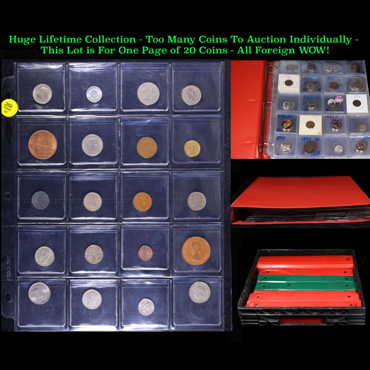 Huge Liifetime Collection - Too Many Coins To Auction Individually - This Lot is For One Page of 20 Foreign Coins. We have received a huge collection of over 10 thousand US coins in flips, 2x2 holders, and 20 coin pages. We are forced, due to limited lots, to sell this collection in pages of 20 coins. All of the pages include Silver Coins. Most contain Indian Cents, Proof Coins, Barber Coinage, Bust Coinage, Lincoln Cents, Flying Eagles, Jefferson Nickels, Roosevelt Dimes, Buffalo Nickels, Eisenhower Dollars, Kennedy Halves, Large Cents including some Draped Bust Large Cents, Mercury Dimes, and Liberty V Nickels. These pages could not be reviewed by anyone in our office due to time constraints. We estimate the value of each page to meet or exceed $200 in value! Good luck and happy hunting.
