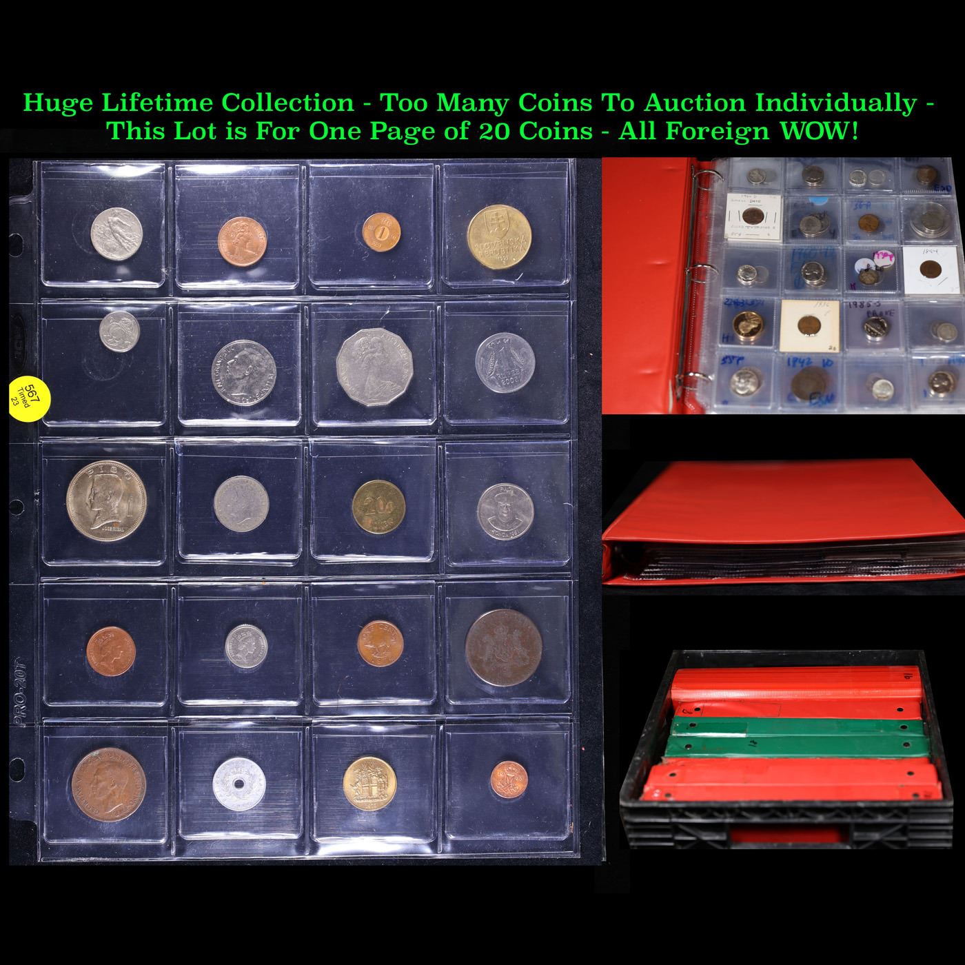 Huge Liifetime Collection - Too Many Coins To Auction Individually - This Lot is For One Page of 20 Foreign Coins. We have received a huge collection of over 10 thousand US coins in flips, 2x2 holders, and 20 coin pages. We are forced, due to limited lots, to sell this collection in pages of 20 coins. All of the pages include Silver Coins. Most contain Indian Cents, Proof Coins, Barber Coinage, Bust Coinage, Lincoln Cents, Flying Eagles, Jefferson Nickels, Roosevelt Dimes, Buffalo Nickels, Eisenhower Dollars, Kennedy Halves, Large Cents including some Draped Bust Large Cents, Mercury Dimes, and Liberty V Nickels. These pages could not be reviewed by anyone in our office due to time constraints. We estimate the value of each page to meet or exceed $200 in value! Good luck and happy hunting.