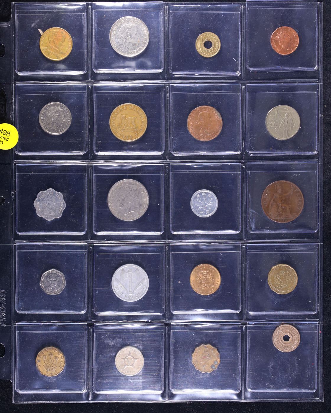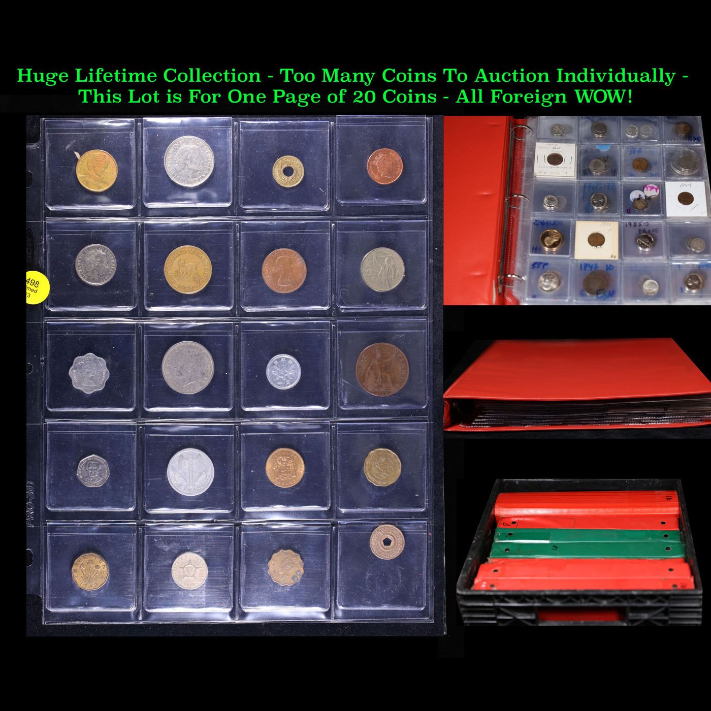 Huge Liifetime Collection - Too Many Coins To Auction Individually - This Lot is For One Page of 20 Foreign Coins. We have received a huge collection of over 10 thousand US coins in flips, 2x2 holders, and 20 coin pages. We are forced, due to limited lots, to sell this collection in pages of 20 coins. All of the pages include Silver Coins. Most contain Indian Cents, Proof Coins, Barber Coinage, Bust Coinage, Lincoln Cents, Flying Eagles, Jefferson Nickels, Roosevelt Dimes, Buffalo Nickels, Eisenhower Dollars, Kennedy Halves, Large Cents including some Draped Bust Large Cents, Mercury Dimes, and Liberty V Nickels. These pages could not be reviewed by anyone in our office due to time constraints. We estimate the value of each page to meet or exceed $200 in value! Good luck and happy hunting.
