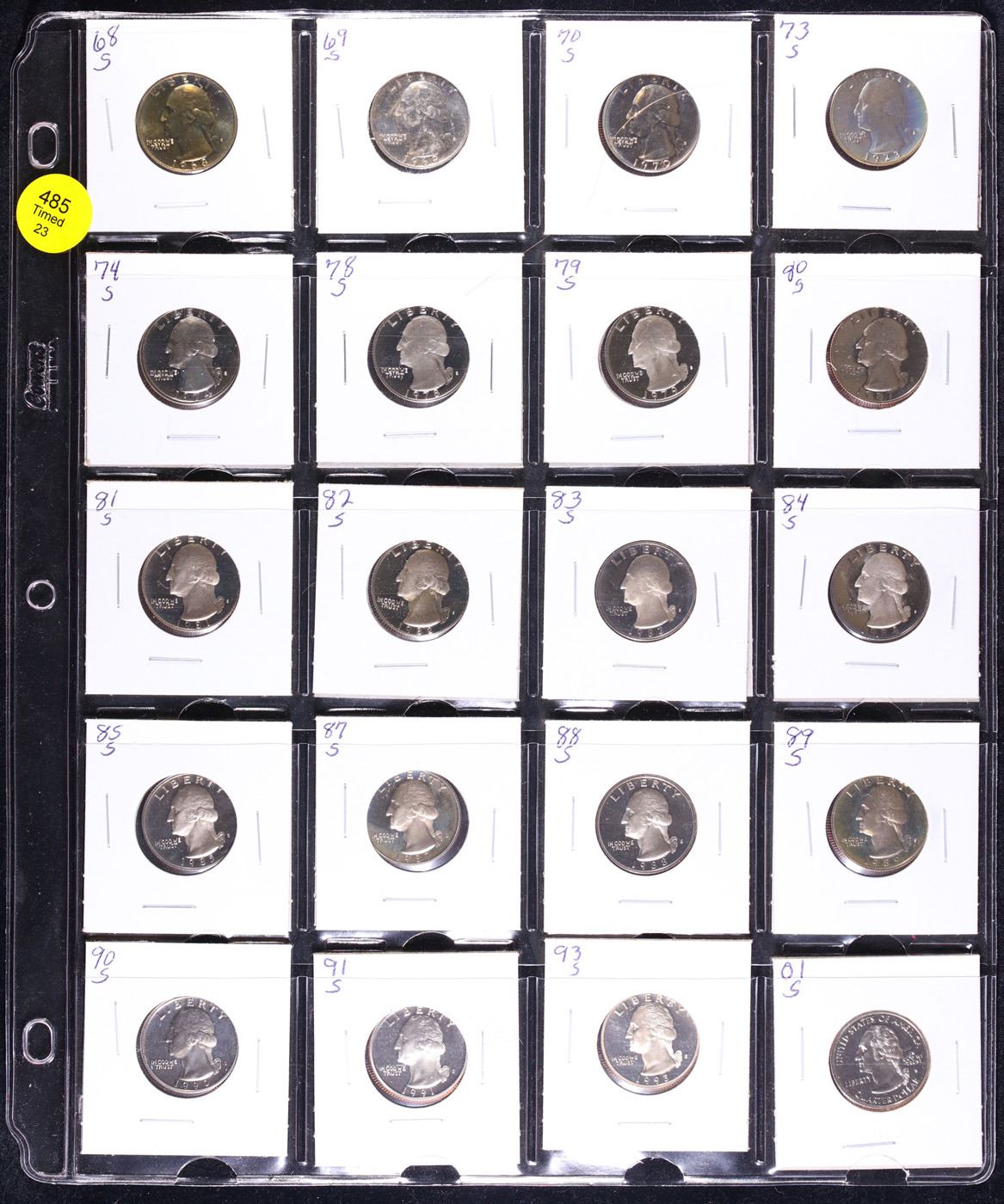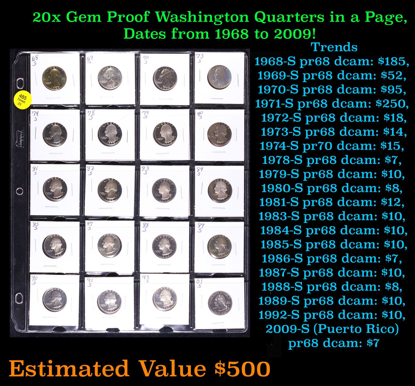 Huge Liifetime Collection - Too Many Coins To Auction Individually - This Lot is For One Page of 20 Proof Washington Quarters Dates Range From 1982-2006. We have received a huge collection of over 10 thousand US coins in flips, 2x2 holders, and 20 coin pages. We are forced, due to limited lots, to sell this collection in pages of 20 coins. This Page is For 20 Proof Washington Quarters Trends 2002-s pr69 DCAM $19 1994-s pr69 DCAM $16, 1982-s pr69 DCAM $15, 2002-s pr69 DCAM $19, 2006-s pr69 DCAM $19, 2003-s pr69 DCAM $19, 2003-s pr69 DCAM $19, 2002-s pr69 DCAM $19, 1993-s pr69 DCAM $16, 1982-s pr69 DCAM $15, 1991-s pr69 DCAM $16, 1982-s pr69 DCAM $15, 1990-s pr69 DCAM $16, 1983-s pr69 DCAM $16, 1985-s pr69 DCAM $16, 1987-s pr69 DCAM $16, 1996-s pr69 DCAM $16, 1993-s pr69 DCAM $16, 1983-s pr69 DCAM $16, 1984-s pr69 DCAM $16. We estimate the value of each page to meet or exceed $200 in value! Good luck and happy hunting.