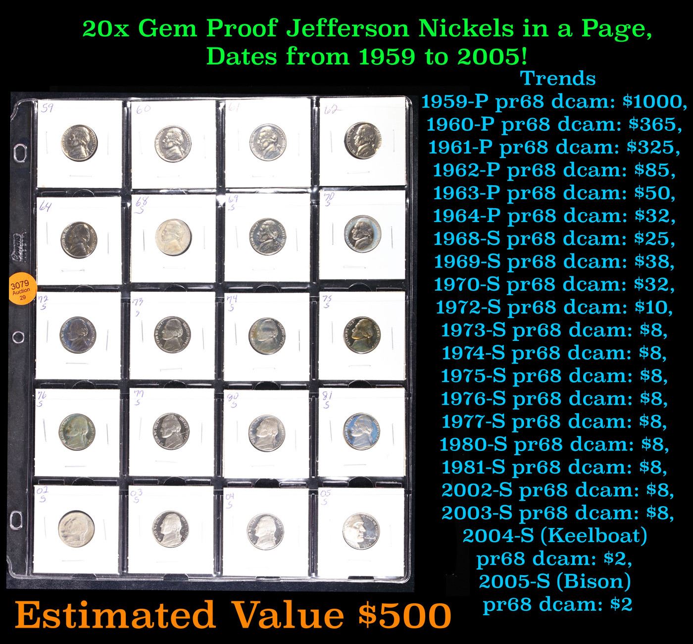 Huge Liifetime Collection - Too Many Coins To Auction Individually - This Lot is For One Page of 20 Proof Jefferson Nickels Dates Range From 1971-2006.