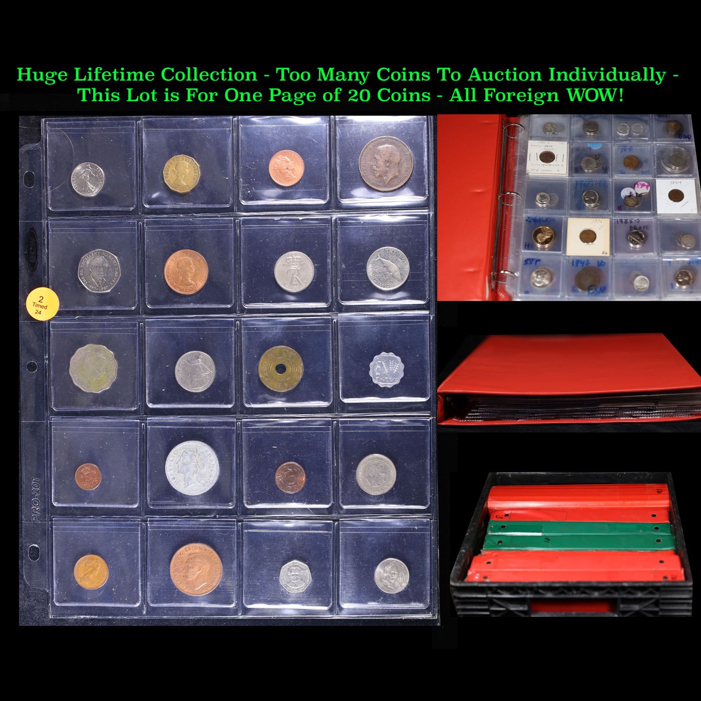 Huge Liifetime Collection - Too Many Coins To Auction Individually - This Lot is For One Page of 20 Foreign Coins. We have received a huge collection of over 10 thousand US coins in flips, 2x2 holders, and 20 coin pages. We are forced, due to limited lots, to sell this collection in pages of 20 coins. All of the pages include Silver Coins. Most contain Indian Cents, Proof Coins, Barber Coinage, Bust Coinage, Lincoln Cents, Flying Eagles, Jefferson Nickels, Roosevelt Dimes, Buffalo Nickels, Eisenhower Dollars, Kennedy Halves, Large Cents including some Draped Bust Large Cents, Mercury Dimes, and Liberty V Nickels. These pages could not be reviewed by anyone in our office due to time constraints. We estimate the value of each page to meet or exceed $200 in value! Good luck and happy hunting.