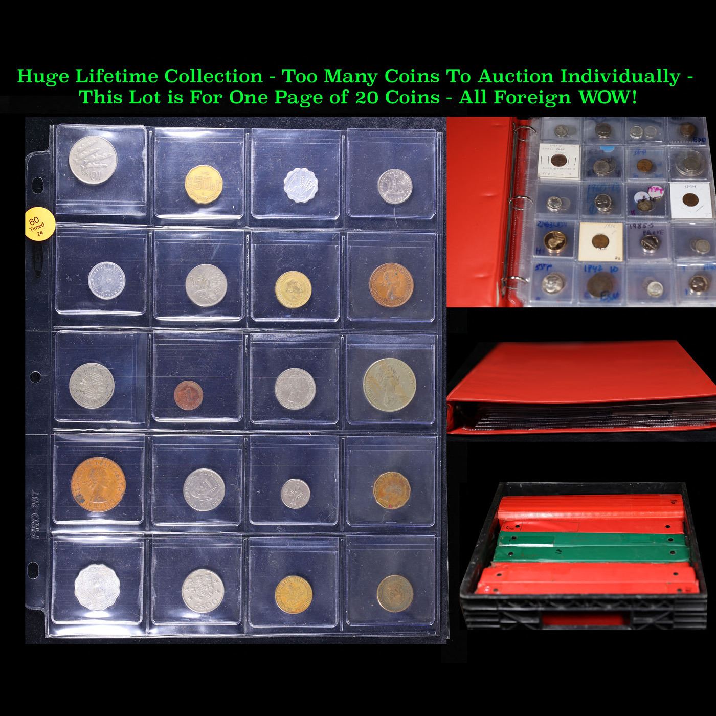 Huge Liifetime Collection - Too Many Coins To Auction Individually - This Lot is For One Page of 20 Foreign Coins. We have received a huge collection of over 10 thousand US coins in flips, 2x2 holders, and 20 coin pages. We are forced, due to limited lots, to sell this collection in pages of 20 coins. All of the pages include Silver Coins. Most contain Indian Cents, Proof Coins, Barber Coinage, Bust Coinage, Lincoln Cents, Flying Eagles, Jefferson Nickels, Roosevelt Dimes, Buffalo Nickels, Eisenhower Dollars, Kennedy Halves, Large Cents including some Draped Bust Large Cents, Mercury Dimes, and Liberty V Nickels. These pages could not be reviewed by anyone in our office due to time constraints. We estimate the value of each page to meet or exceed $200 in value! Good luck and happy hunting.