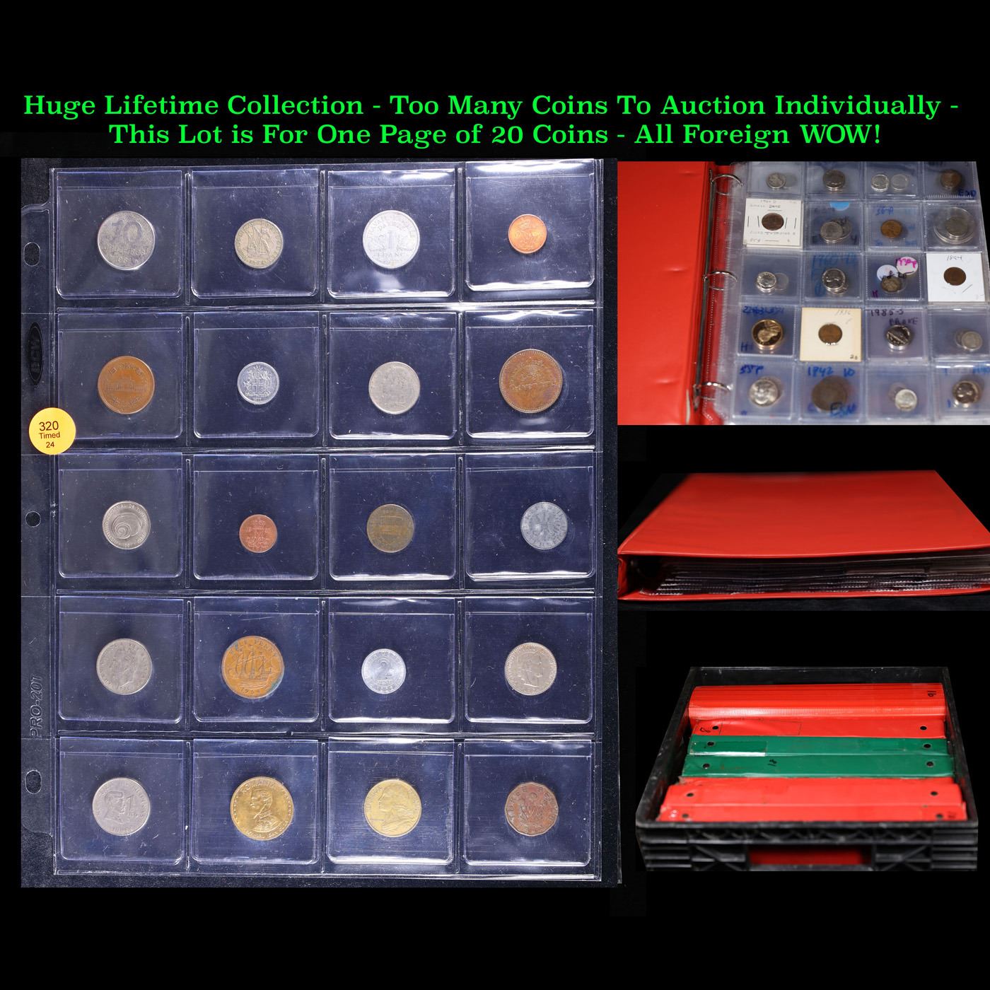 Huge Liifetime Collection - Too Many Coins To Auction Individually - This Lot is For One Page of 20 Foreign Coins. We have received a huge collection of over 10 thousand US coins in flips, 2x2 holders, and 20 coin pages. We are forced, due to limited lots, to sell this collection in pages of 20 coins. All of the pages include Silver Coins. Most contain Indian Cents, Proof Coins, Barber Coinage, Bust Coinage, Lincoln Cents, Flying Eagles, Jefferson Nickels, Roosevelt Dimes, Buffalo Nickels, Eisenhower Dollars, Kennedy Halves, Large Cents including some Draped Bust Large Cents, Mercury Dimes, and Liberty V Nickels. These pages could not be reviewed by anyone in our office due to time constraints. We estimate the value of each page to meet or exceed $200 in value! Good luck and happy hunting.
