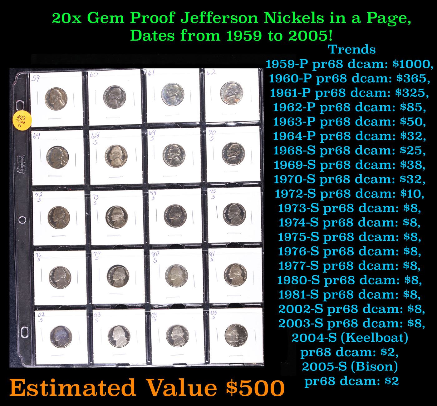 Huge Liifetime Collection - Too Many Coins To Auction Individually - This Lot is For One Page of 20 Proof Jefferson Nickels Dates Range From 1971-2006. We have received a huge collection of over 10 thousand US coins in flips, 2x2 holders, and 20 coin pages. We are forced, due to limited lots, to sell this collection in pages of 20 coins. This Page is For 20 Proof Jefferson Nickels. Trends 1987-s pr69 DCAM $15, 1980-s pr69 DCAM $10, 2006-s pr69 DCAM $15, 1985-s pr69 DCAM $15, 1972-s pr69 DCAM $36, 2002-s pr69 DCAM $15, 1971-s pr69 DCAM $200, 2006-s pr69 DCAM $15, 1981-s pr69 DCAM $20, 1983-s pr69 DCAM $15, 1992-s pr69 DCAM $15, 1992-s pr69 DCAM $15, 1980-s pr69 DCAM $10, 1980-s pr69 DCAM $10, 2001-s pr69 DCAM $15, 1981-s pr69 DCAM $20, 1993-s pr69 DCAM $15, 1985-s pr69 DCAM $15, 1991-s pr69 DCAM $15, 1980-s pr69 DCAM $10. We estimate the value of each page to meet or exceed $200 in value! Good luck and happy hunting.