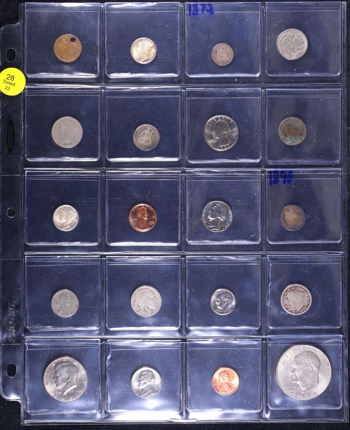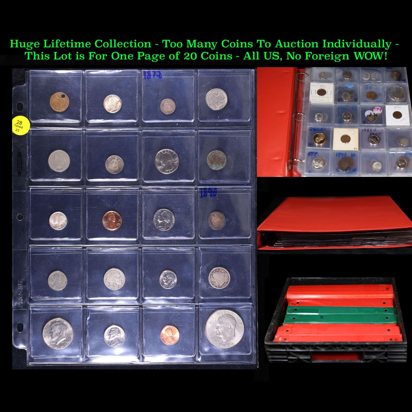 Huge Liifetime Collection - Too Many Coins To Auction Individually - This Lot is For One Page of 20 Coins - All US, No Foreign WOW!. We have received a huge collection of over 10 thousand US coins in flips, 2x2 holders, and 20 coin pages. We are forced, due to limited lots, to sell this collection in pages of 20 coins. All of the pages include Silver Coins. Most contain Indian Cents, Proof Coins, Barber Coinage, Bust Coinage, Lincoln Cents, Flying Eagles, Jefferson Nickels, Roosevelt Dimes, Buffalo Nickels, Eisenhower Dollars, Kennedy Halves, Large Cents including some Draped Bust Large Cents, Mercury Dimes, and Liberty V Nickels. These pages could not be reviewed by anyone in our office due to time constraints. We estimate the value of each page to meet or exceed $200 in value! Good luck and happy hunting.