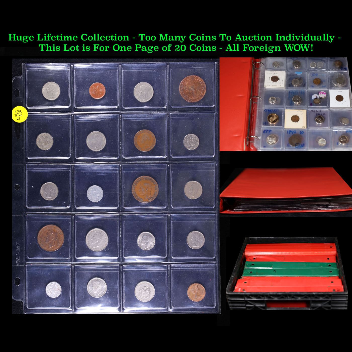 Huge Liifetime Collection - Too Many Coins To Auction Individually - This Lot is For One Page of 20 Foreign Coins. We have received a huge collection of over 10 thousand US coins in flips, 2x2 holders, and 20 coin pages. We are forced, due to limited lots, to sell this collection in pages of 20 coins. All of the pages include Silver Coins. Most contain Indian Cents, Proof Coins, Barber Coinage, Bust Coinage, Lincoln Cents, Flying Eagles, Jefferson Nickels, Roosevelt Dimes, Buffalo Nickels, Eisenhower Dollars, Kennedy Halves, Large Cents including some Draped Bust Large Cents, Mercury Dimes, and Liberty V Nickels. These pages could not be reviewed by anyone in our office due to time constraints. We estimate the value of each page to meet or exceed $200 in value! Good luck and happy hunting.