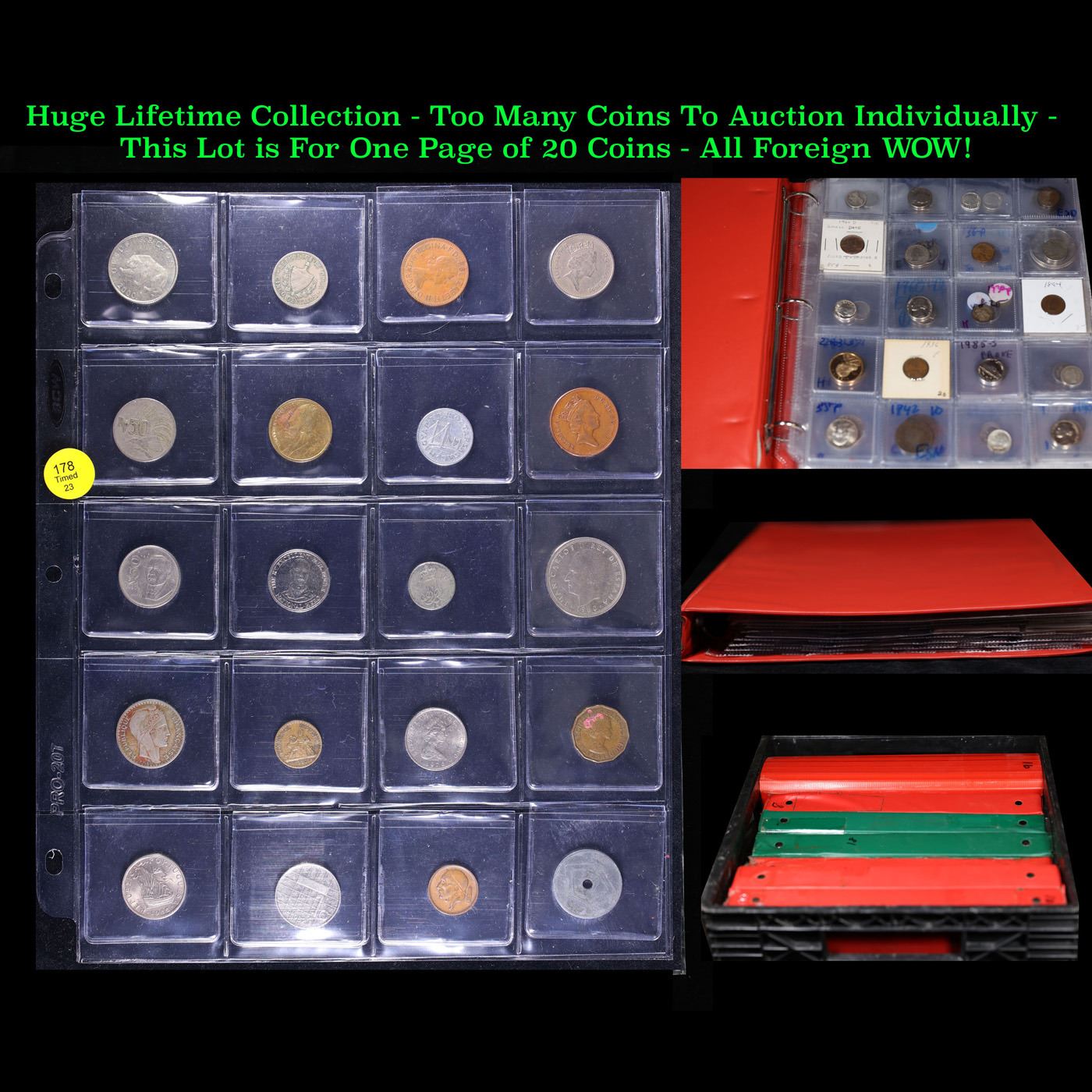 Huge Liifetime Collection - Too Many Coins To Auction Individually - This Lot is For One Page of 20 Foreign Coins. We have received a huge collection of over 10 thousand US coins in flips, 2x2 holders, and 20 coin pages. We are forced, due to limited lots, to sell this collection in pages of 20 coins. All of the pages include Silver Coins. Most contain Indian Cents, Proof Coins, Barber Coinage, Bust Coinage, Lincoln Cents, Flying Eagles, Jefferson Nickels, Roosevelt Dimes, Buffalo Nickels, Eisenhower Dollars, Kennedy Halves, Large Cents including some Draped Bust Large Cents, Mercury Dimes, and Liberty V Nickels. These pages could not be reviewed by anyone in our office due to time constraints. We estimate the value of each page to meet or exceed $200 in value! Good luck and happy hunting.