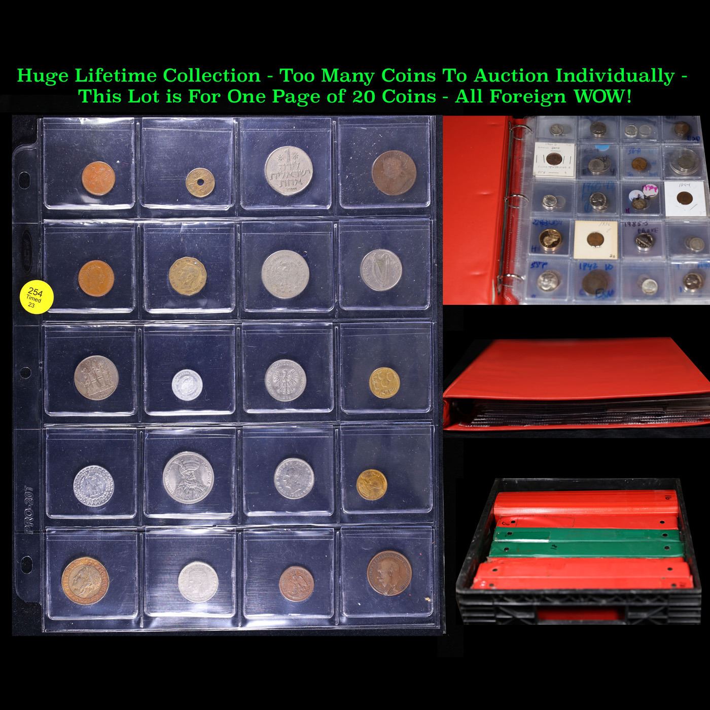Huge Liifetime Collection - Too Many Coins To Auction Individually - This Lot is For One Page of 20 Foreign Coins. We have received a huge collection of over 10 thousand US coins in flips, 2x2 holders, and 20 coin pages. We are forced, due to limited lots, to sell this collection in pages of 20 coins. All of the pages include Silver Coins. Most contain Indian Cents, Proof Coins, Barber Coinage, Bust Coinage, Lincoln Cents, Flying Eagles, Jefferson Nickels, Roosevelt Dimes, Buffalo Nickels, Eisenhower Dollars, Kennedy Halves, Large Cents including some Draped Bust Large Cents, Mercury Dimes, and Liberty V Nickels. These pages could not be reviewed by anyone in our office due to time constraints. We estimate the value of each page to meet or exceed $200 in value! Good luck and happy hunting.