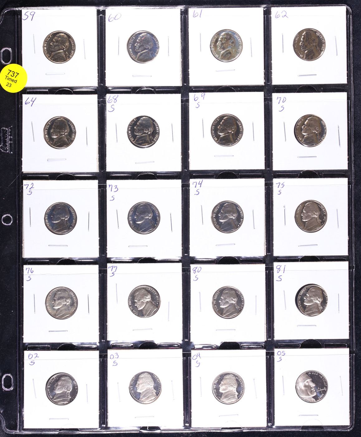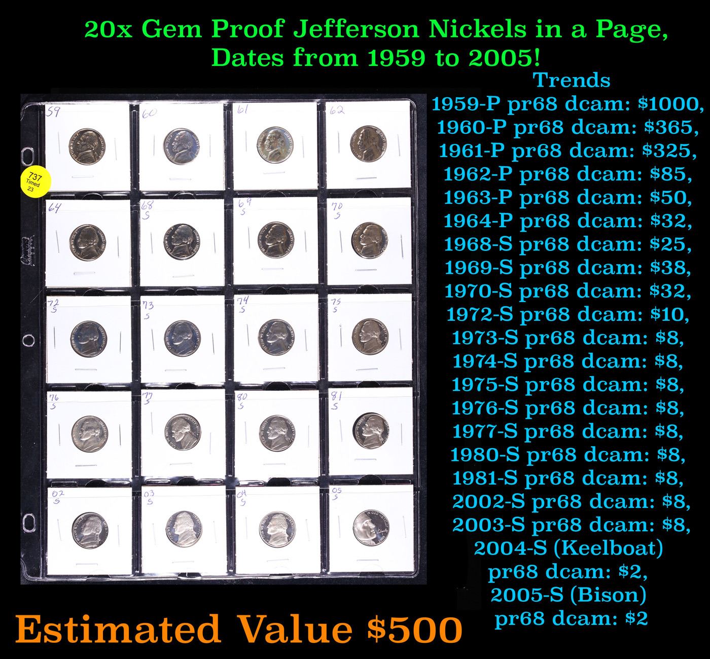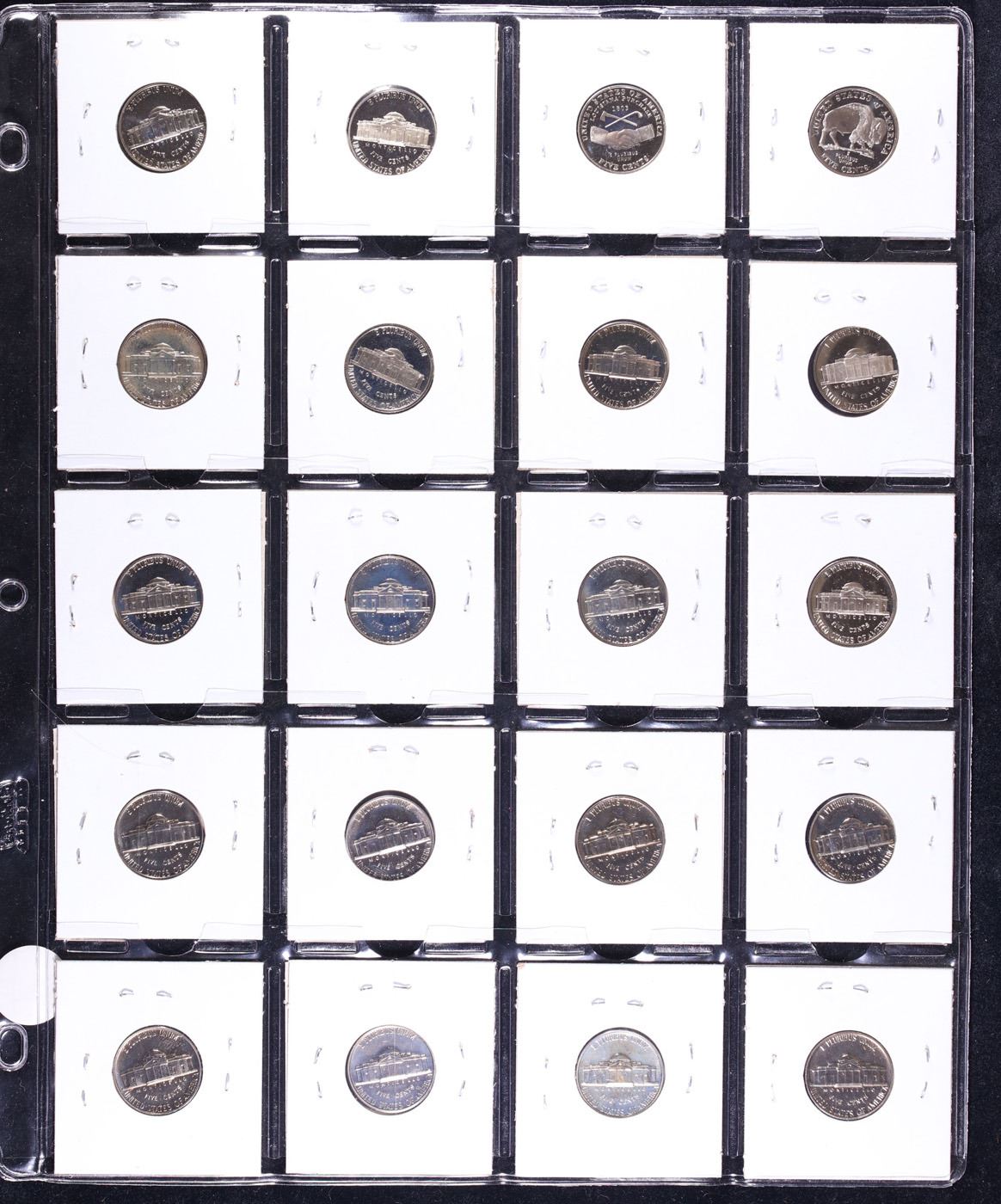 Huge Liifetime Collection - Too Many Coins To Auction Individually - This Lot is For One Page of 20 Proof Jefferson Nickels Dates Range From 1971-2006. We have received a huge collection of over 10 thousand US coins in flips, 2x2 holders, and 20 coin pages. We are forced, due to limited lots, to sell this collection in pages of 20 coins. This Page is For 20 Proof Jefferson Nickels. Trends 1987-s pr69 DCAM $15, 1980-s pr69 DCAM $10, 2006-s pr69 DCAM $15, 1985-s pr69 DCAM $15, 1972-s pr69 DCAM $36, 2002-s pr69 DCAM $15, 1971-s pr69 DCAM $200, 2006-s pr69 DCAM $15, 1981-s pr69 DCAM $20, 1983-s pr69 DCAM $15, 1992-s pr69 DCAM $15, 1992-s pr69 DCAM $15, 1980-s pr69 DCAM $10, 1980-s pr69 DCAM $10, 2001-s pr69 DCAM $15, 1981-s pr69 DCAM $20, 1993-s pr69 DCAM $15, 1985-s pr69 DCAM $15, 1991-s pr69 DCAM $15, 1980-s pr69 DCAM $10. We estimate the value of each page to meet or exceed $200 in value! Good luck and happy hunting.