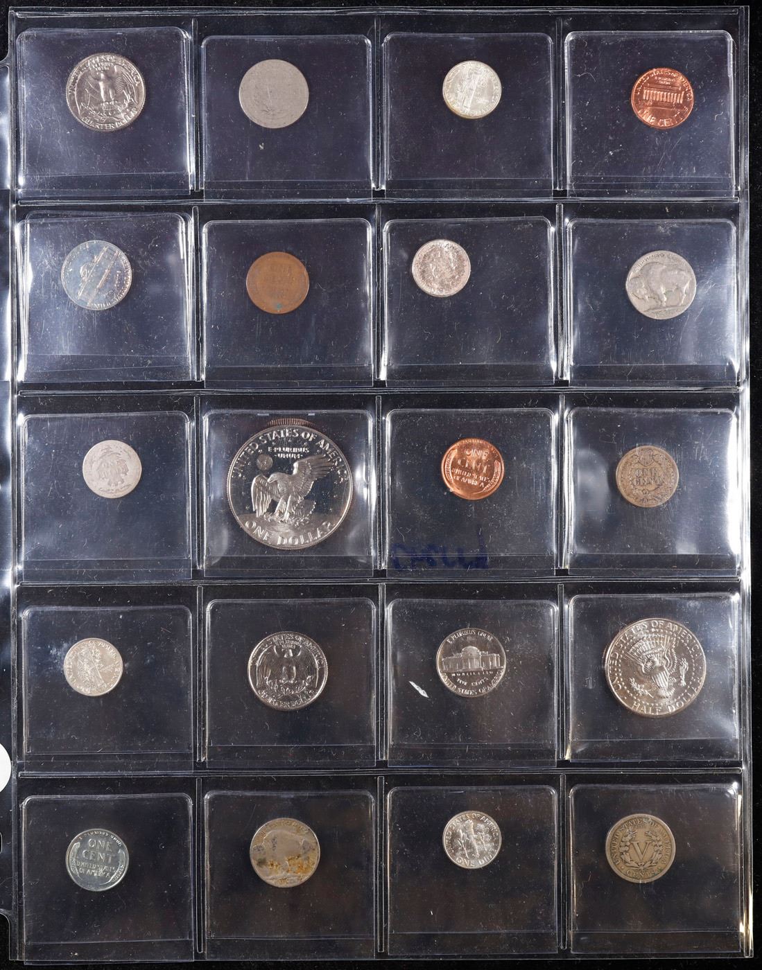 Huge Liifetime Collection - Too Many Coins To Auction Individually - This Lot is For One Page of 20 Coins - All US, No Foreign WOW!. We have received a huge collection of over 10 thousand US coins in flips, 2x2 holders, and 20 coin pages. We are forced, due to limited lots, to sell this collection in pages of 20 coins. All of the pages include Silver Coins. Most contain Indian Cents, Proof Coins, Barber Coinage, Bust Coinage, Lincoln Cents, Flying Eagles, Jefferson Nickels, Roosevelt Dimes, Buffalo Nickels, Eisenhower Dollars, Kennedy Halves, Large Cents including some Draped Bust Large Cents, Mercury Dimes, and Liberty V Nickels. These pages could not be reviewed by anyone in our office due to time constraints. We estimate the value of each page to meet or exceed $200 in value! Good luck and happy hunting.