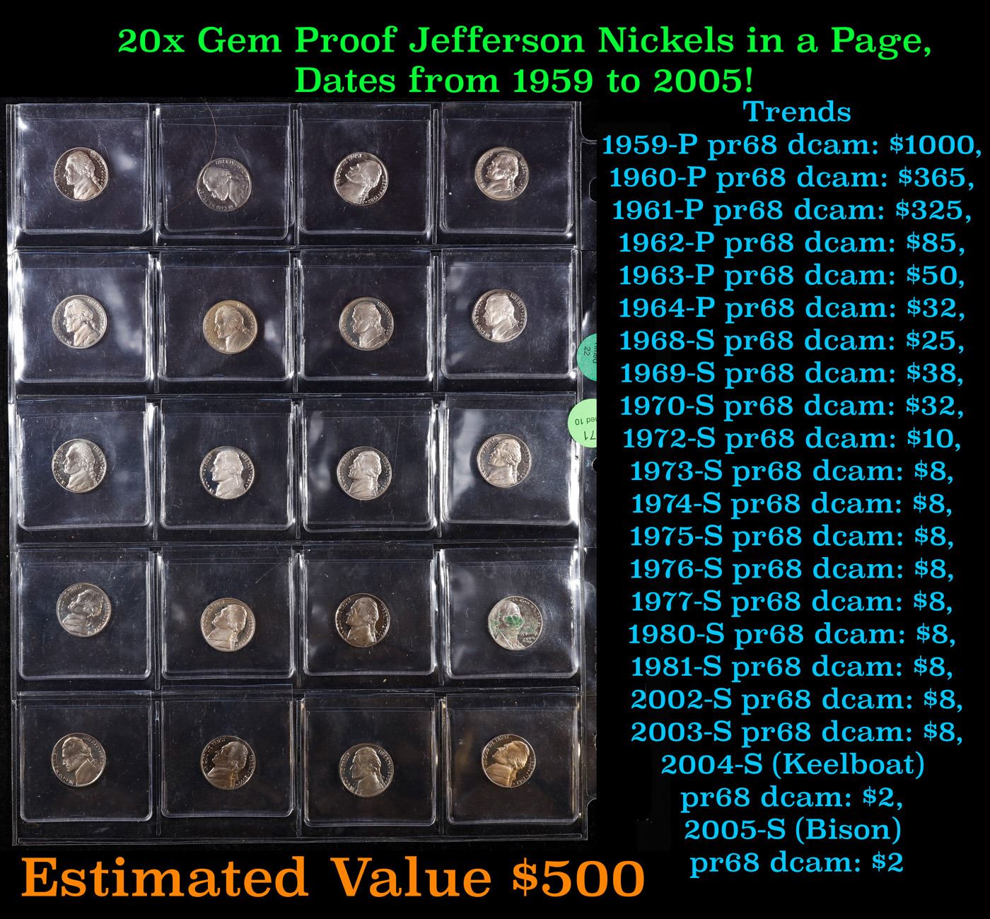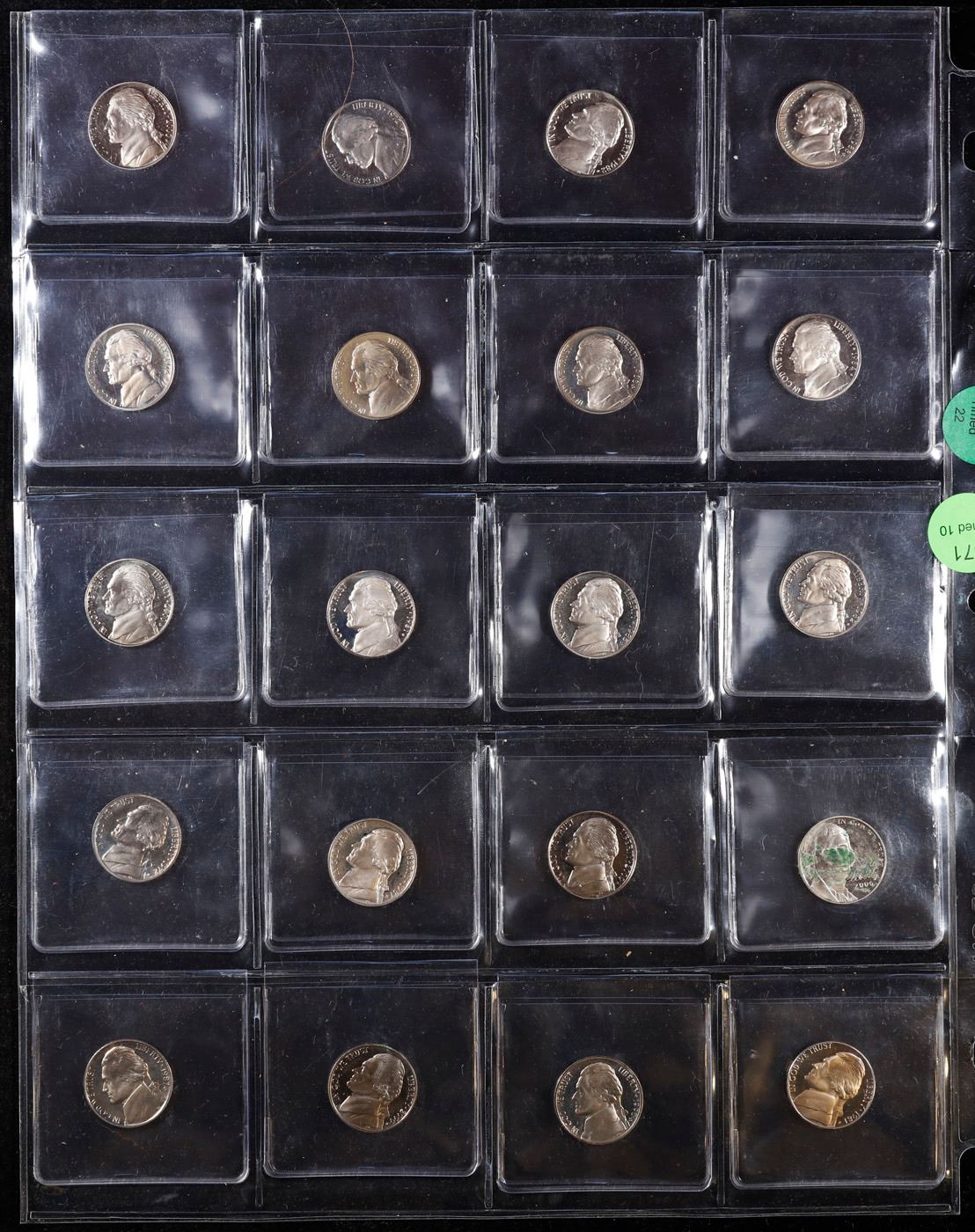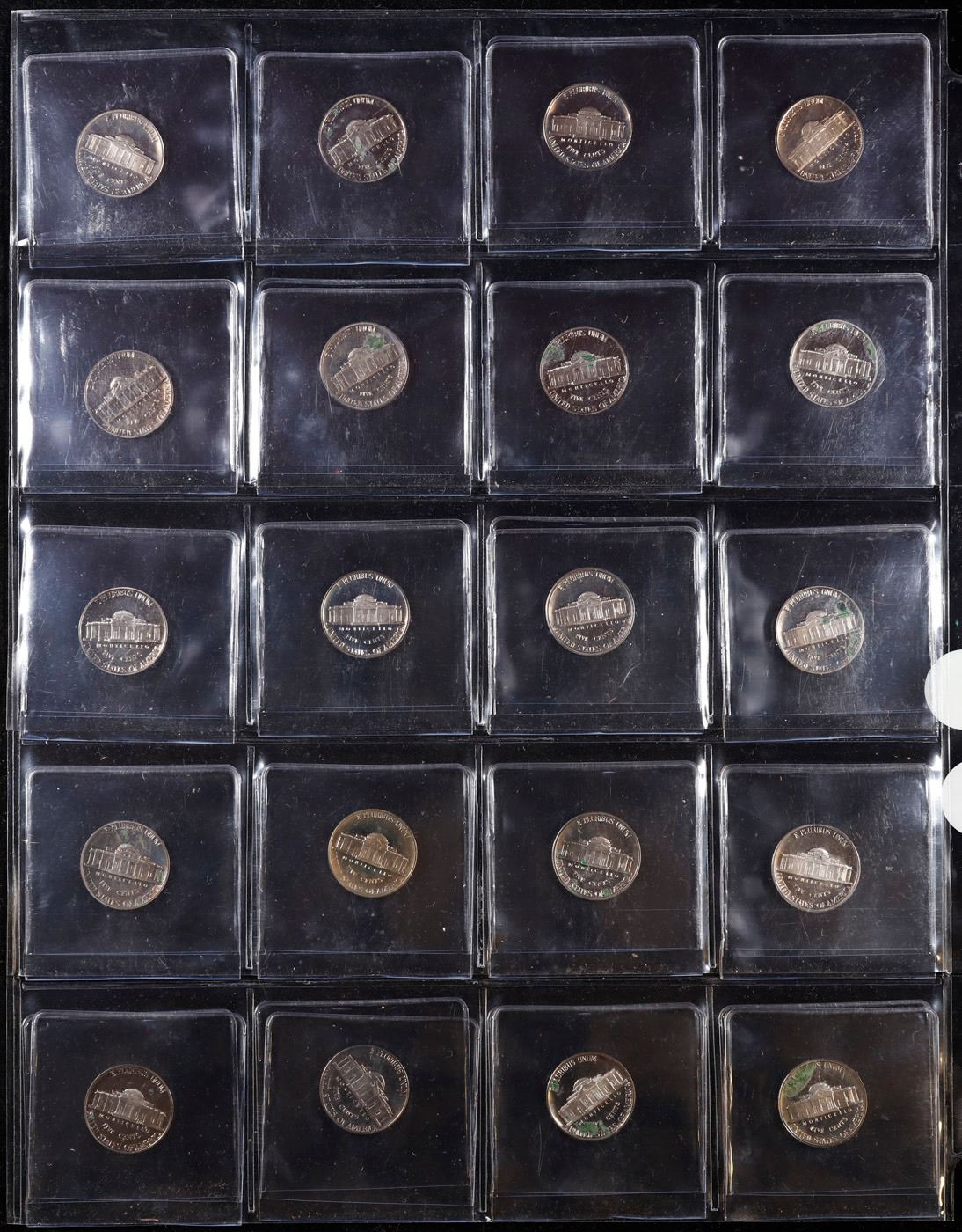Huge Liifetime Collection - Too Many Coins To Auction Individually - This Lot is For One Page of 20 Proof Jefferson Nickels Dates Range From 1971-2006. We have received a huge collection of over 10 thousand US coins in flips, 2x2 holders, and 20 coin pages. We are forced, due to limited lots, to sell this collection in pages of 20 coins. This Page is For 20 Proof Jefferson Nickels. Trends 1987-s pr69 DCAM $15, 1980-s pr69 DCAM $10, 2006-s pr69 DCAM $15, 1985-s pr69 DCAM $15, 1972-s pr69 DCAM $36, 2002-s pr69 DCAM $15, 1971-s pr69 DCAM $200, 2006-s pr69 DCAM $15, 1981-s pr69 DCAM $20, 1983-s pr69 DCAM $15, 1992-s pr69 DCAM $15, 1992-s pr69 DCAM $15, 1980-s pr69 DCAM $10, 1980-s pr69 DCAM $10, 2001-s pr69 DCAM $15, 1981-s pr69 DCAM $20, 1993-s pr69 DCAM $15, 1985-s pr69 DCAM $15, 1991-s pr69 DCAM $15, 1980-s pr69 DCAM $10. We estimate the value of each page to meet or exceed $200 in value! Good luck and happy hunting.
