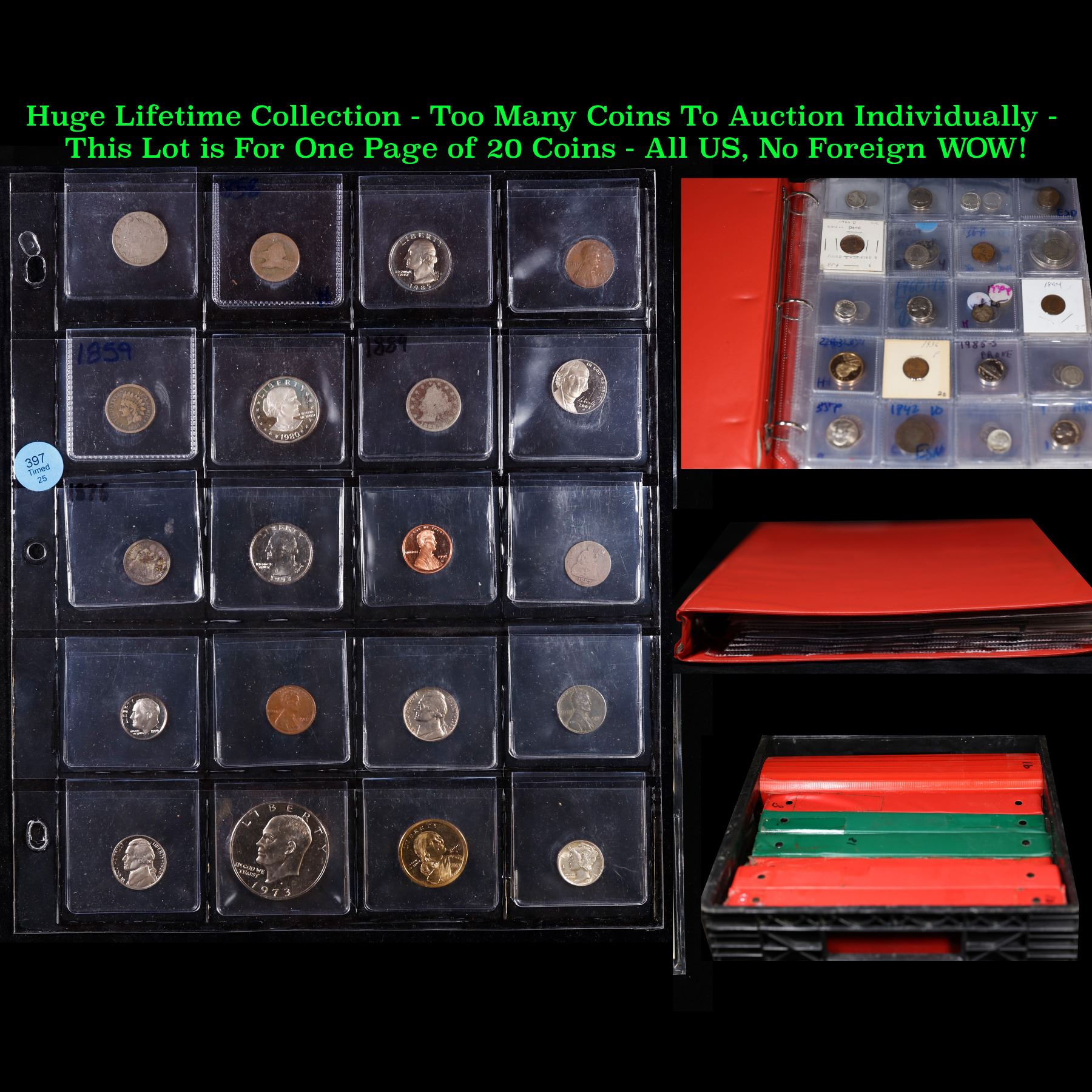 Huge Liifetime Collection - Too Many Coins To Auction Individually - This Lot is For One Page of 20 Coins - All US, No Foreign WOW!. We have received a huge collection of over 10 thousand US coins in flips, 2x2 holders, and 20 coin pages. We are forced, due to limited lots, to sell this collection in pages of 20 coins. All of the pages include Silver Coins. Most contain Indian Cents, Proof Coins, Barber Coinage, Bust Coinage, Lincoln Cents, Flying Eagles, Jefferson Nickels, Roosevelt Dimes, Buffalo Nickels, Eisenhower Dollars, Kennedy Halves, Large Cents including some Draped Bust Large Cents, Mercury Dimes, and Liberty V Nickels. These pages could not be reviewed by anyone in our office due to time constraints. We estimate the value of each page to meet or exceed $200 in value! Good luck and happy hunting.