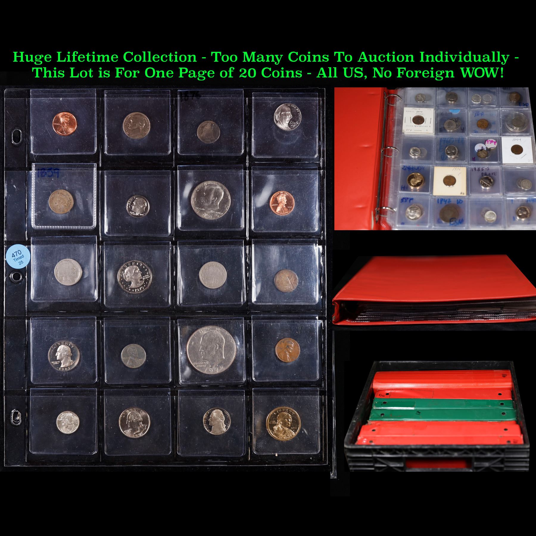 Huge Liifetime Collection - Too Many Coins To Auction Individually - This Lot is For One Page of 20 Coins - All US, No Foreign WOW!. We have received a huge collection of over 10 thousand US coins in flips, 2x2 holders, and 20 coin pages. We are forced, due to limited lots, to sell this collection in pages of 20 coins. All of the pages include Silver Coins. Most contain Indian Cents, Proof Coins, Barber Coinage, Bust Coinage, Lincoln Cents, Flying Eagles, Jefferson Nickels, Roosevelt Dimes, Buffalo Nickels, Eisenhower Dollars, Kennedy Halves, Large Cents including some Draped Bust Large Cents, Mercury Dimes, and Liberty V Nickels. These pages could not be reviewed by anyone in our office due to time constraints. We estimate the value of each page to meet or exceed $200 in value! Good luck and happy hunting.