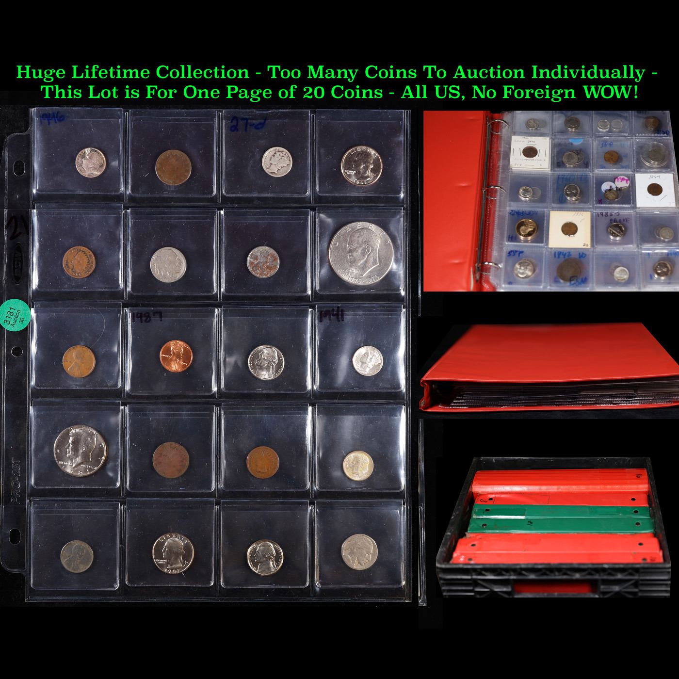 Huge Liifetime Collection - Too Many Coins To Auction Individually - This Lot is For One Page of 20 Coins - All US, No Foreign WOW!. We have received a huge collection of over 10 thousand US coins in flips, 2x2 holders, and 20 coin pages. We are forced, due to limited lots, to sell this collection in pages of 20 coins. All of the pages include Silver Coins. Most contain Indian Cents, Proof Coins, Barber Coinage, Bust Coinage, Lincoln Cents, Flying Eagles, Jefferson Nickels, Roosevelt Dimes, Buffalo Nickels, Eisenhower Dollars, Kennedy Halves, Large Cents including some Draped Bust Large Cents, Mercury Dimes, and Liberty V Nickels. These pages could not be reviewed by anyone in our office due to time constraints. We estimate the value of each page to meet or exceed $200 in value! Good luck and happy hunting.