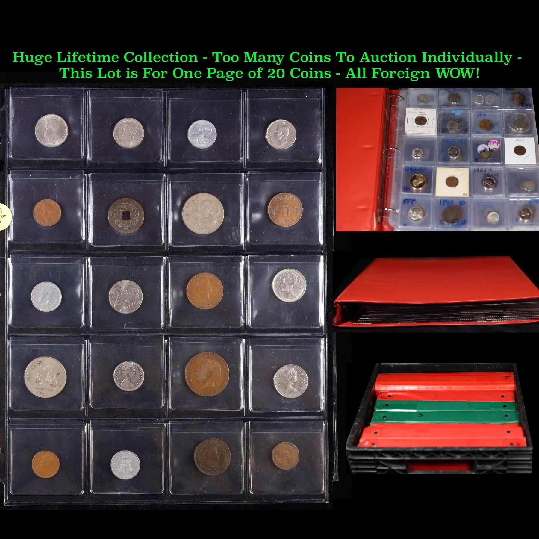 Huge Liifetime Collection - Too Many Coins To Auction Individually - This Lot is For One Page of 20 Foreign Coins. We have received a huge collection of over 10 thousand US coins in flips, 2x2 holders, and 20 coin pages. We are forced, due to limited lots, to sell this collection in pages of 20 coins. All of the pages include Silver Coins. Most contain Indian Cents, Proof Coins, Barber Coinage, Bust Coinage, Lincoln Cents, Flying Eagles, Jefferson Nickels, Roosevelt Dimes, Buffalo Nickels, Eisenhower Dollars, Kennedy Halves, Large Cents including some Draped Bust Large Cents, Mercury Dimes, and Liberty V Nickels. These pages could not be reviewed by anyone in our office due to time constraints. We estimate the value of each page to meet or exceed $200 in value! Good luck and happy hunting.