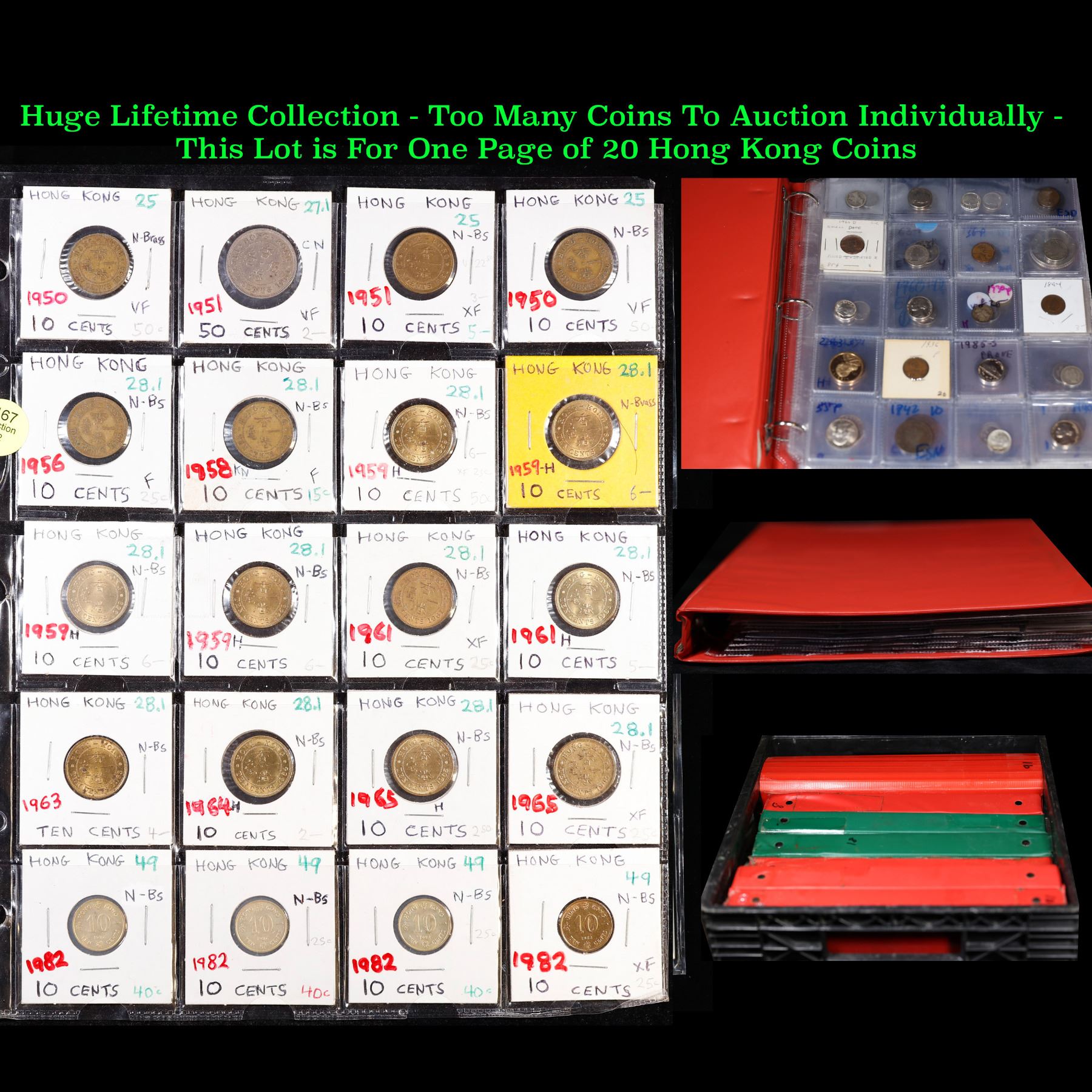 Huge Liifetime Collection - Too Many Coins To Auction Individually - This Lot is For One Page of 20 Hong Kong Coins. We have received a huge collection of over 10 thousand US coins in flips, 2x2 holders, and 20 coin pages. We are forced, due to limited lots, to sell this collection in pages of 20 coins. All of the pages include Silver Coins. Most contain Indian Cents, Proof Coins, Barber Coinage, Bust Coinage, Lincoln Cents, Flying Eagles, Jefferson Nickels, Roosevelt Dimes, Buffalo Nickels, Eisenhower Dollars, Kennedy Halves, Large Cents including some Draped Bust Large Cents, Mercury Dimes, and Liberty V Nickels. These pages could not be reviewed by anyone in our office due to time constraints. We estimate the value of each page to meet or exceed $200 in value! Good luck and happy hunting.