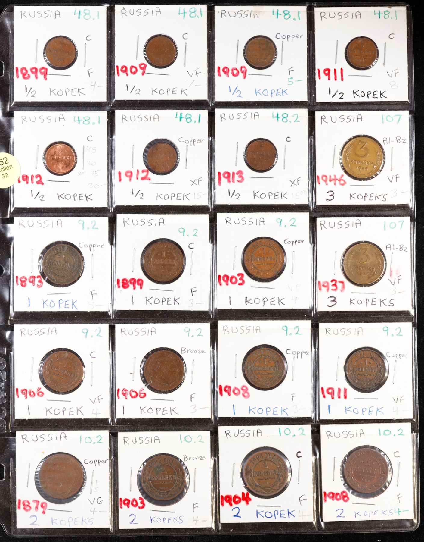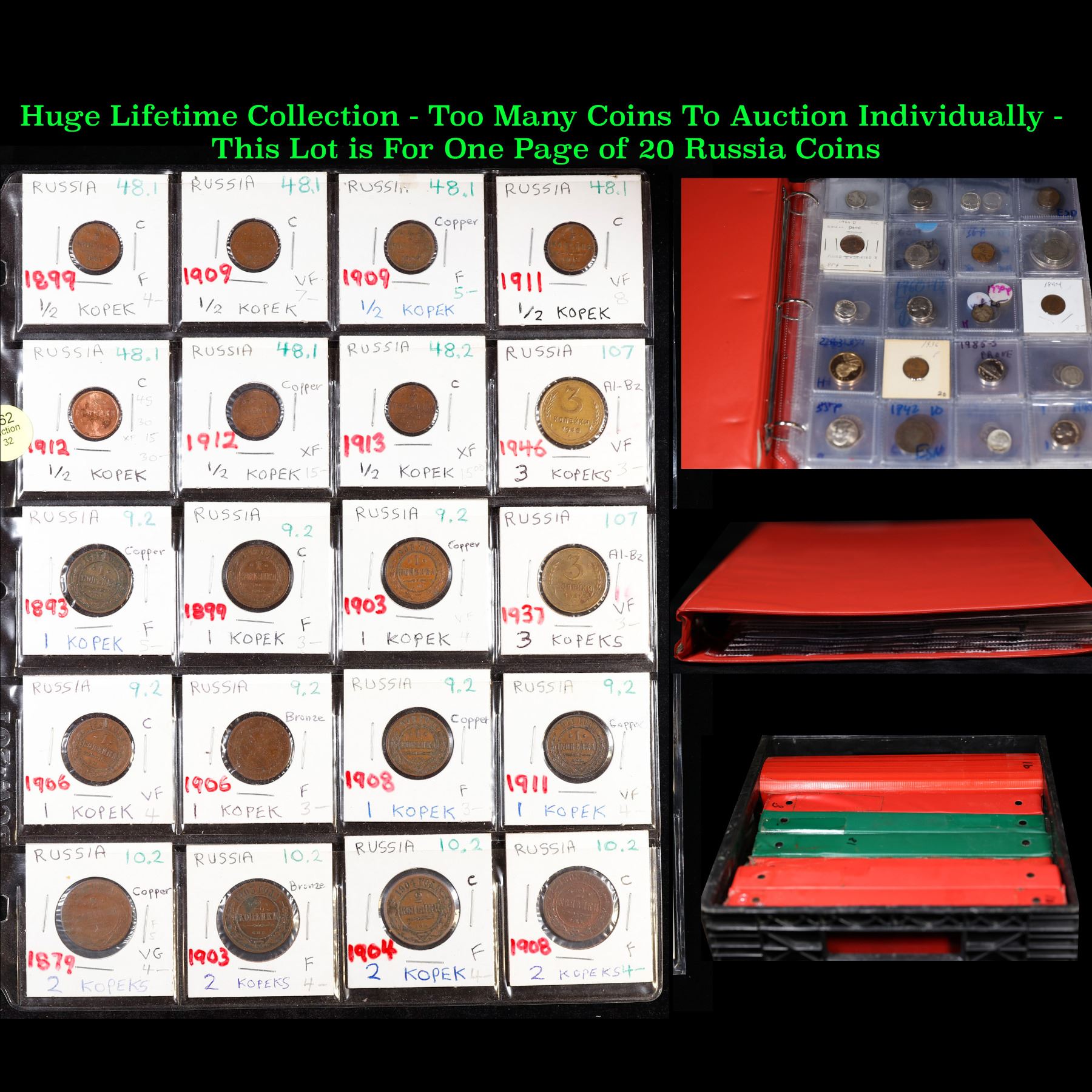Huge Liifetime Collection - Too Many Coins To Auction Individually - This Lot is For One Page of 20 Russia Coins. We have received a huge collection of over 10 thousand US coins in flips, 2x2 holders, and 20 coin pages. We are forced, due to limited lots, to sell this collection in pages of 20 coins. All of the pages include Silver Coins. Most contain Indian Cents, Proof Coins, Barber Coinage, Bust Coinage, Lincoln Cents, Flying Eagles, Jefferson Nickels, Roosevelt Dimes, Buffalo Nickels, Eisenhower Dollars, Kennedy Halves, Large Cents including some Draped Bust Large Cents, Mercury Dimes, and Liberty V Nickels. These pages could not be reviewed by anyone in our office due to time constraints. We estimate the value of each page to meet or exceed $200 in value! Good luck and happy hunting.