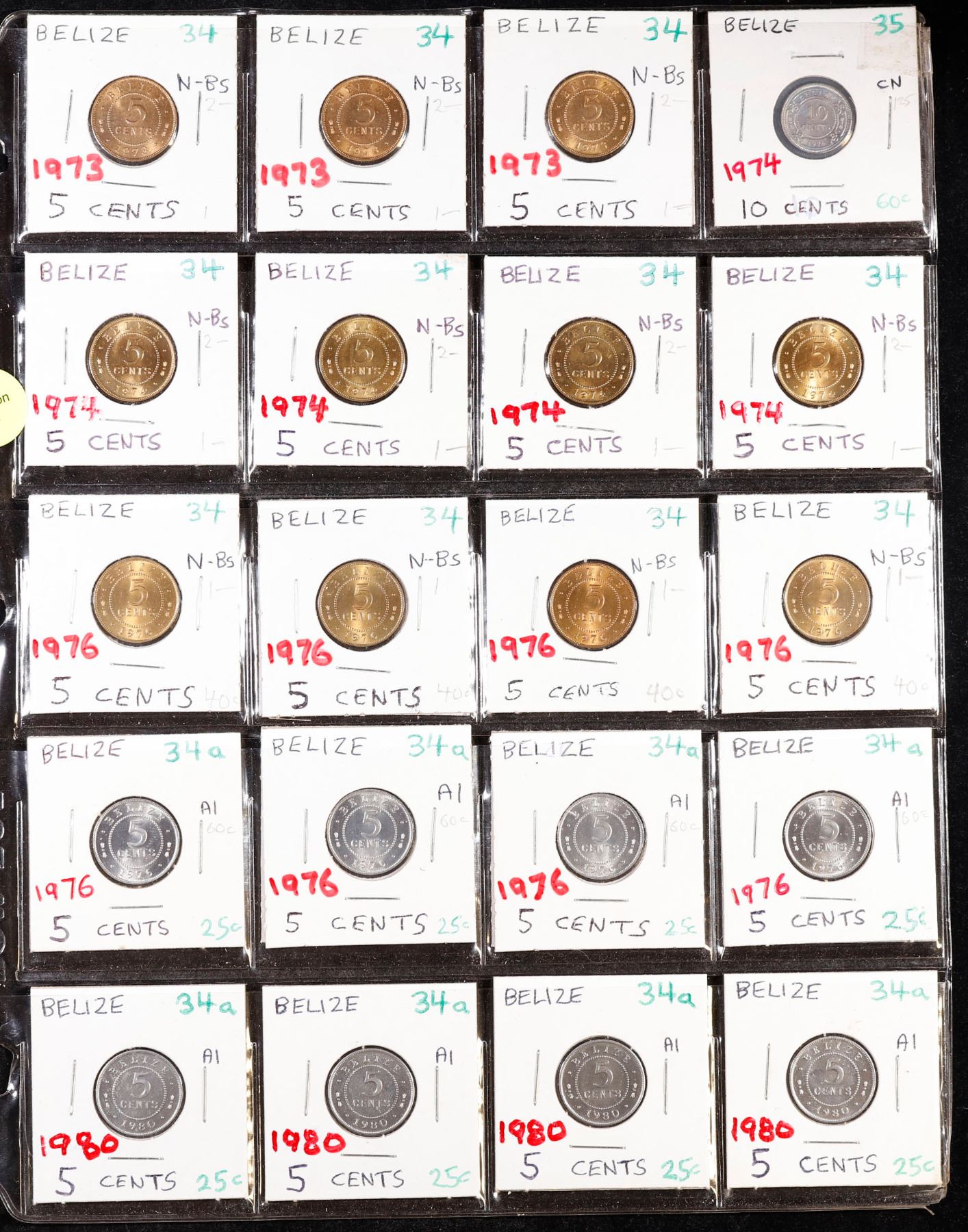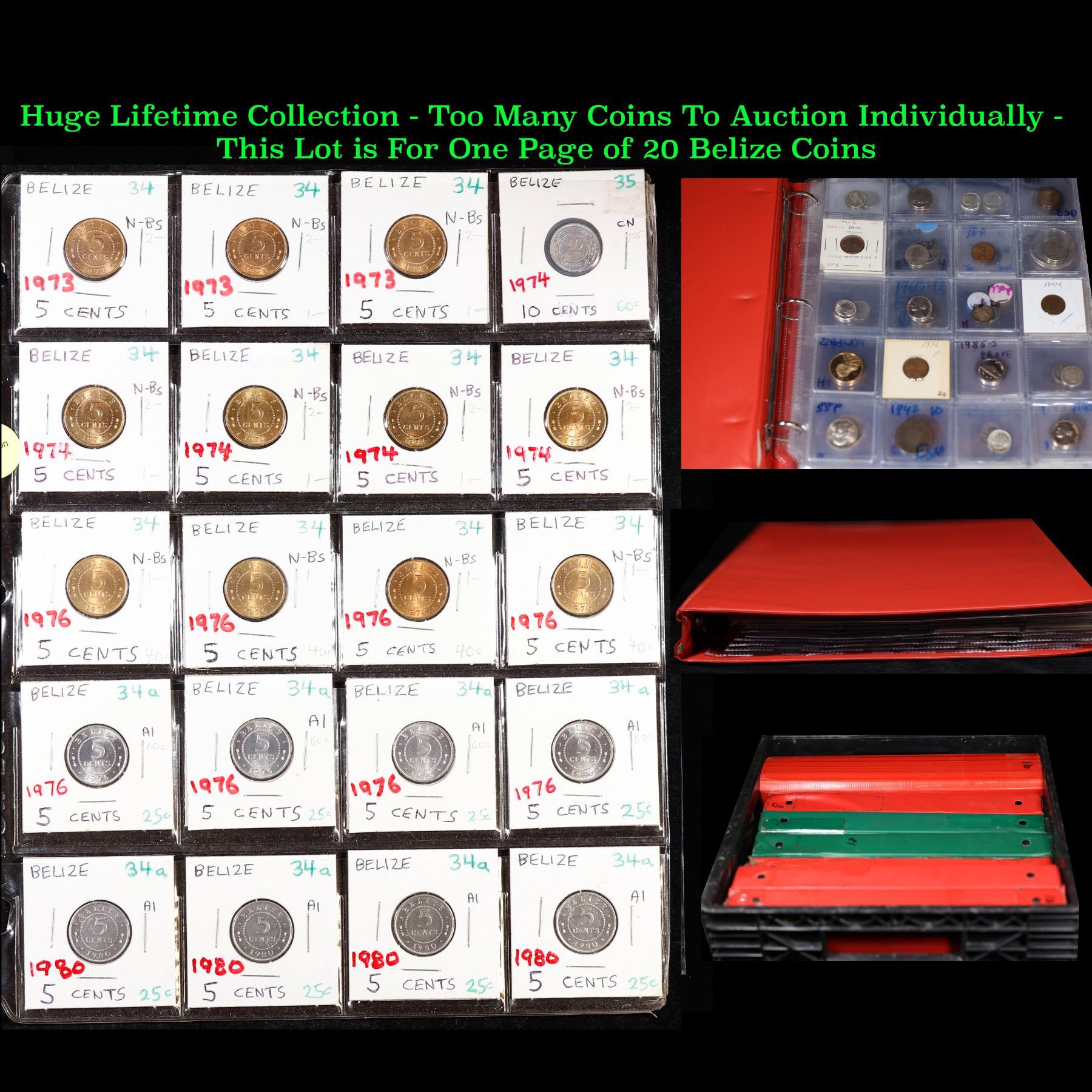 Huge Liifetime Collection - Too Many Coins To Auction Individually - This Lot is For One Page of 20 Belize Coins. We have received a huge collection of over 10 thousand US coins in flips, 2x2 holders, and 20 coin pages. We are forced, due to limited lots, to sell this collection in pages of 20 coins. All of the pages include Silver Coins. Most contain Indian Cents, Proof Coins, Barber Coinage, Bust Coinage, Lincoln Cents, Flying Eagles, Jefferson Nickels, Roosevelt Dimes, Buffalo Nickels, Eisenhower Dollars, Kennedy Halves, Large Cents including some Draped Bust Large Cents, Mercury Dimes, and Liberty V Nickels. These pages could not be reviewed by anyone in our office due to time constraints. We estimate the value of each page to meet or exceed $200 in value! Good luck and happy hunting.