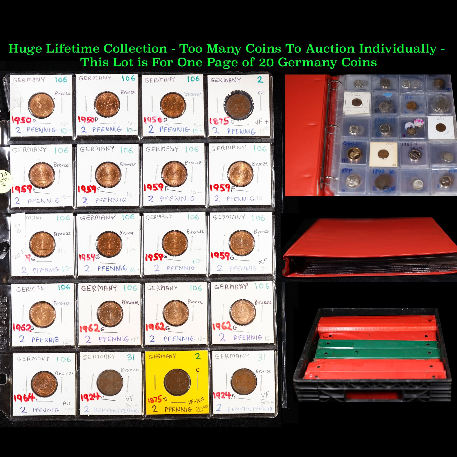 Huge Liifetime Collection - Too Many Coins To Auction Individually - This Lot is For One Page of 20 Germany Coins. We have received a huge collection of over 10 thousand US coins in flips, 2x2 holders, and 20 coin pages. We are forced, due to limited lots, to sell this collection in pages of 20 coins. All of the pages include Silver Coins. Most contain Indian Cents, Proof Coins, Barber Coinage, Bust Coinage, Lincoln Cents, Flying Eagles, Jefferson Nickels, Roosevelt Dimes, Buffalo Nickels, Eisenhower Dollars, Kennedy Halves, Large Cents including some Draped Bust Large Cents, Mercury Dimes, and Liberty V Nickels. These pages could not be reviewed by anyone in our office due to time constraints. We estimate the value of each page to meet or exceed $200 in value! Good luck and happy hunting.