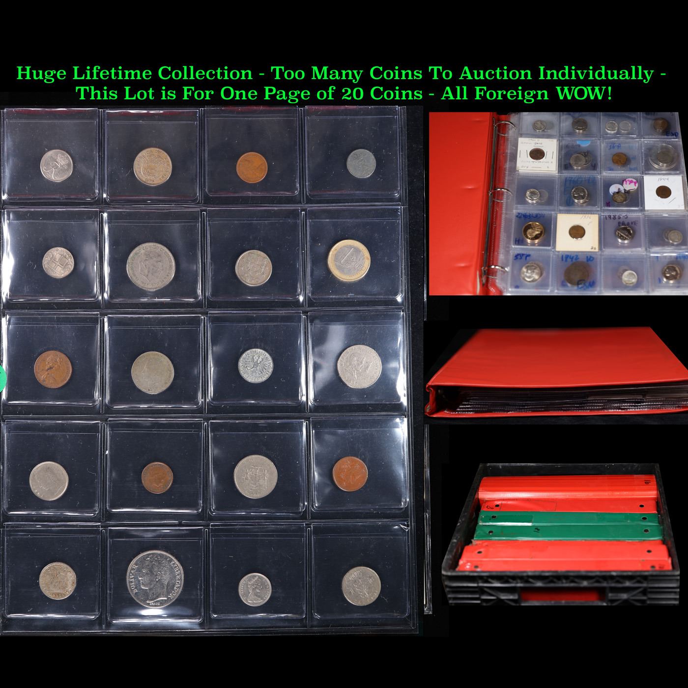 Huge Liifetime Collection - Too Many Coins To Auction Individually - This Lot is For One Page of 20 Foreign Coins. We have received a huge collection of over 10 thousand US coins in flips, 2x2 holders, and 20 coin pages. We are forced, due to limited lots, to sell this collection in pages of 20 coins. All of the pages include Silver Coins. These pages could not be reviewed by anyone in our office due to time constraints. We estimate the value of each page to meet or exceed $200 in value! Good luck and happy hunting.