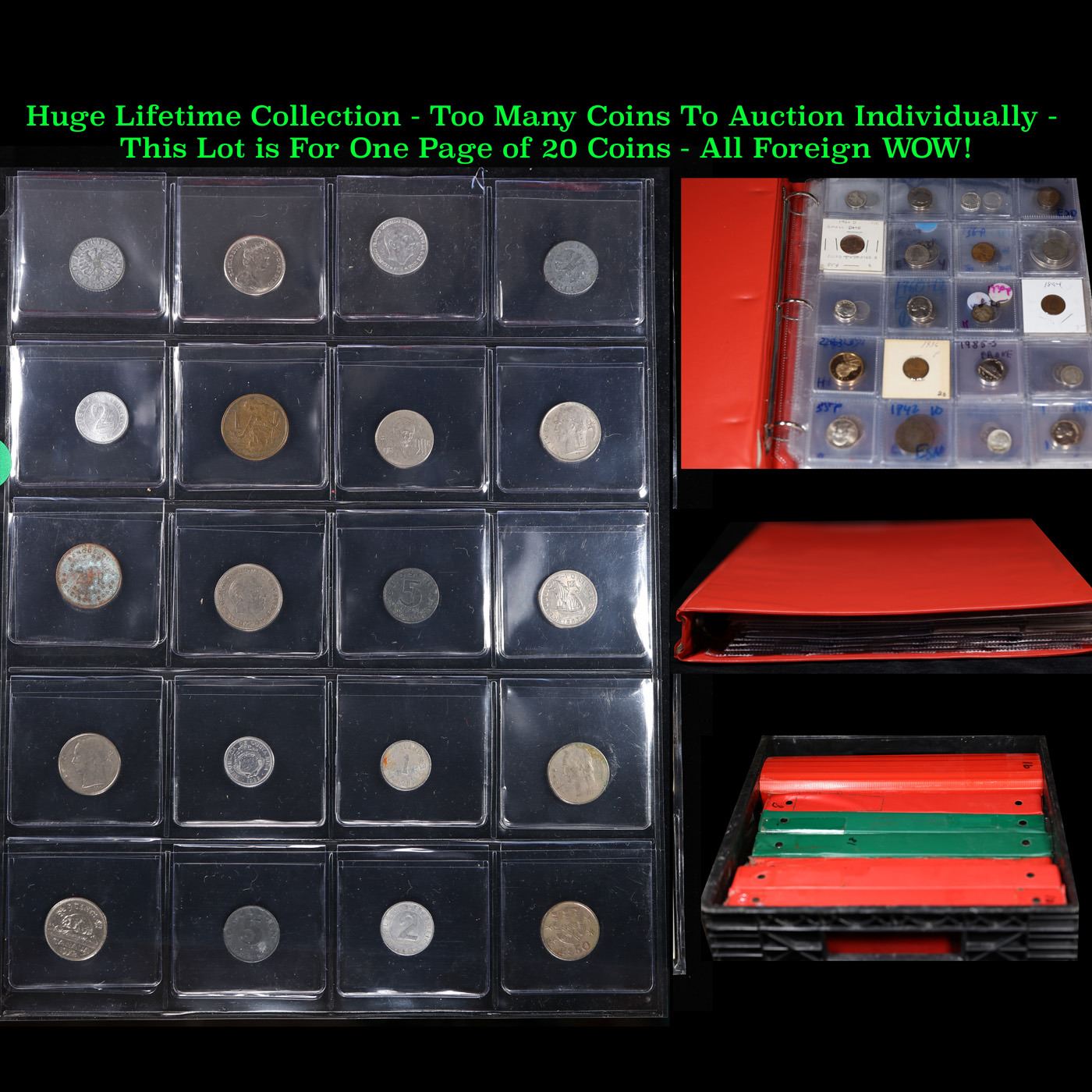 Huge Liifetime Collection - Too Many Coins To Auction Individually - This Lot is For One Page of 20 Foreign Coins. We have received a huge collection of over 10 thousand US coins in flips, 2x2 holders, and 20 coin pages. We are forced, due to limited lots, to sell this collection in pages of 20 coins. All of the pages include Silver Coins. These pages could not be reviewed by anyone in our office due to time constraints. We estimate the value of each page to meet or exceed $200 in value! Good luck and happy hunting.