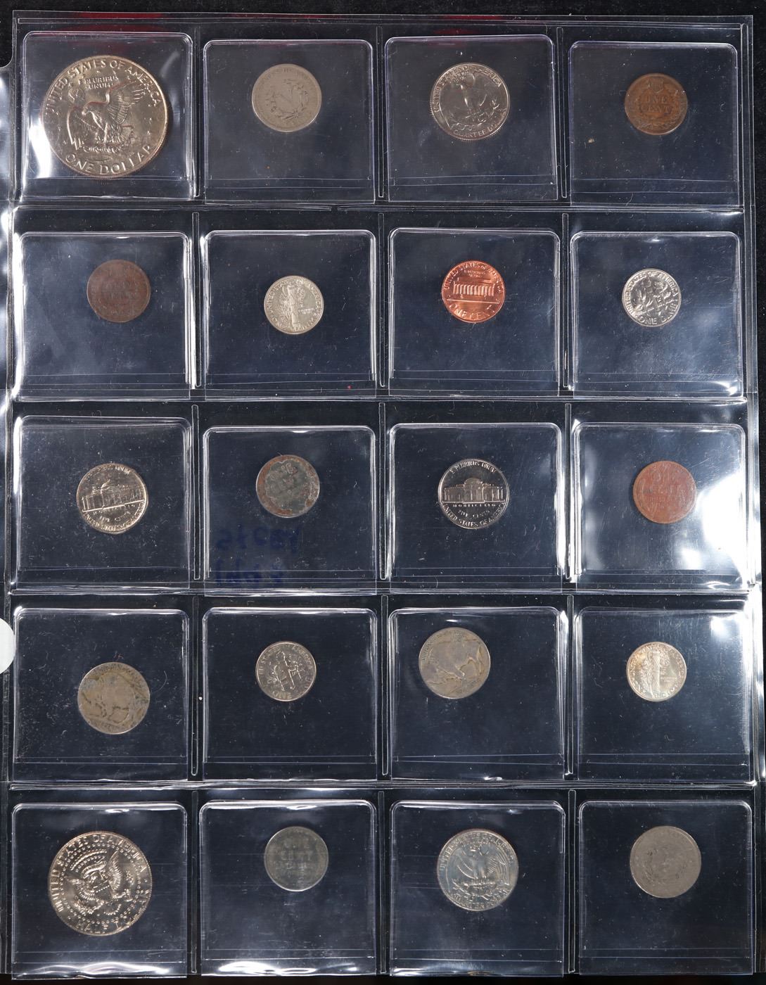 Huge Liifetime Collection - Too Many Coins To Auction Individually - This Lot is For One Page of 20 Coins - All US, No Foreign WOW!. We have received a huge collection of over 10 thousand US coins in flips, 2x2 holders, and 20 coin pages. We are forced, due to limited lots, to sell this collection in pages of 20 coins. All of the pages include Silver Coins. Most contain Indian Cents, Proof Coins, Barber Coinage, Bust Coinage, Lincoln Cents, Flying Eagles, Jefferson Nickels, Roosevelt Dimes, Buffalo Nickels, Eisenhower Dollars, Kennedy Halves, Large Cents including some Draped Bust Large Cents, Mercury Dimes, and Liberty V Nickels. These pages could not be reviewed by anyone in our office due to time constraints. We estimate the value of each page to meet or exceed $200 in value! Good luck and happy hunting.