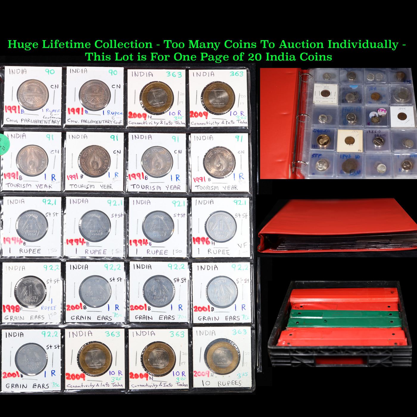 Huge Liifetime Collection - Too Many Coins To Auction Individually - This Lot is For One Page of 20 India Coins. We have received a huge collection of over 10 thousand US coins in flips, 2x2 holders, and 20 coin pages. We are forced, due to limited lots, to sell this collection in pages of 20 coins. All of the pages include Silver Coins. These pages could not be reviewed by anyone in our office due to time constraints. We estimate the value of each page to meet or exceed $200 in value! Good luck and happy hunting.