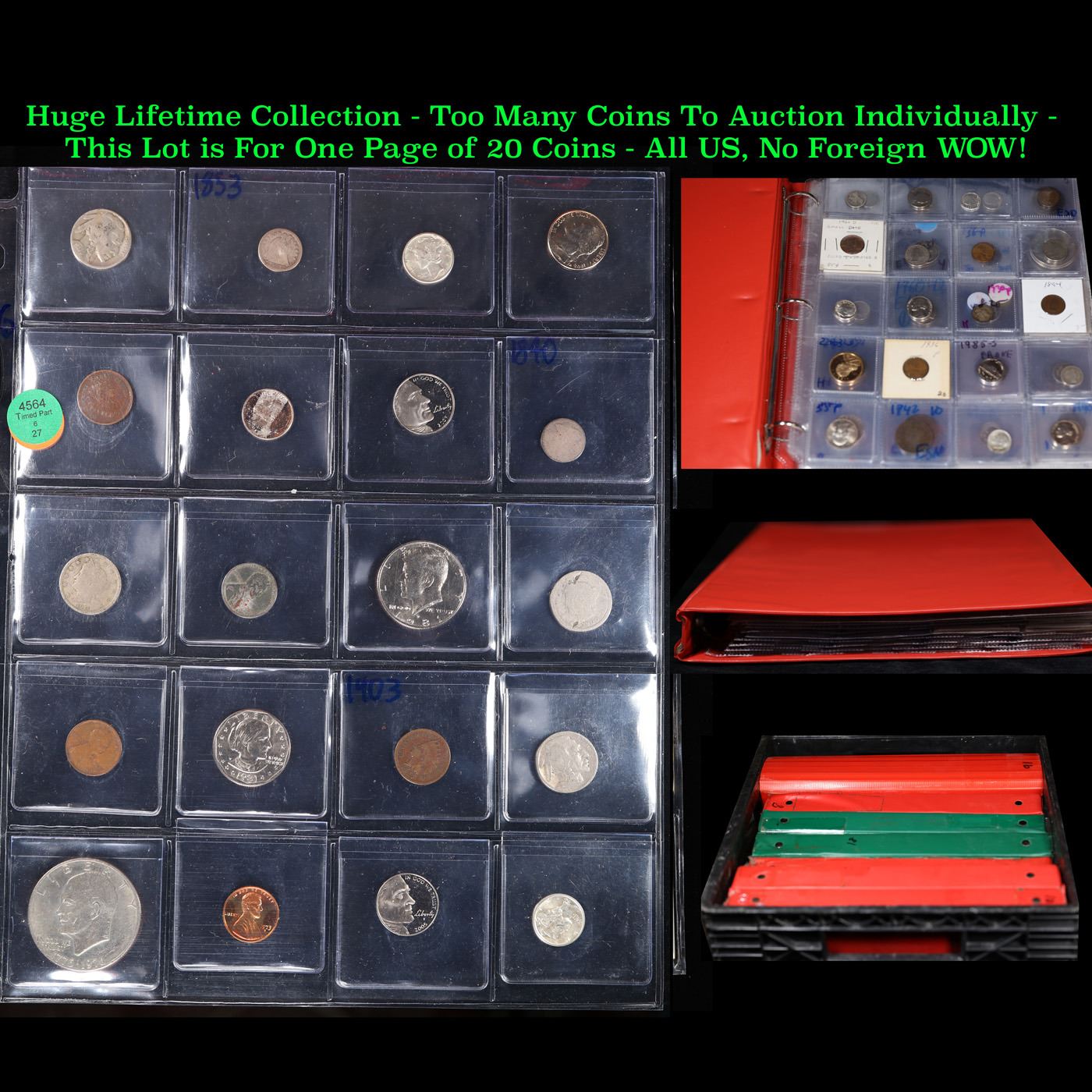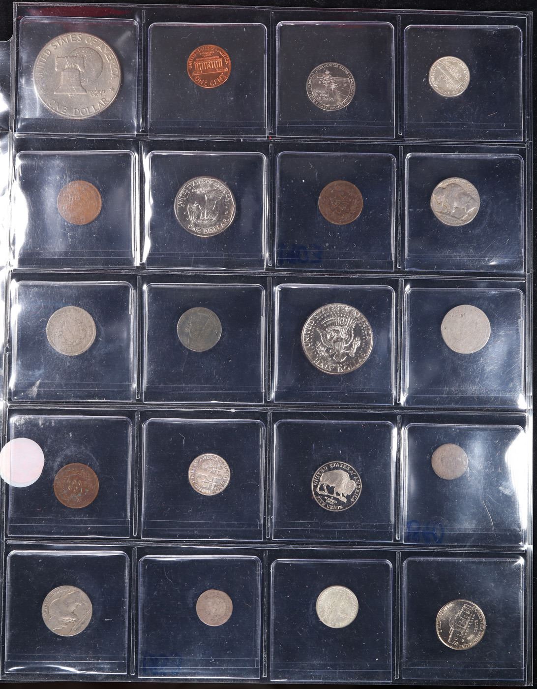 Huge Liifetime Collection - Too Many Coins To Auction Individually - This Lot is For One Page of 20 Coins - All US, No Foreign WOW!. We have received a huge collection of over 10 thousand US coins in flips, 2x2 holders, and 20 coin pages. We are forced, due to limited lots, to sell this collection in pages of 20 coins. All of the pages include Silver Coins. Most contain Indian Cents, Proof Coins, Barber Coinage, Bust Coinage, Lincoln Cents, Flying Eagles, Jefferson Nickels, Roosevelt Dimes, Buffalo Nickels, Eisenhower Dollars, Kennedy Halves, Large Cents including some Draped Bust Large Cents, Mercury Dimes, and Liberty V Nickels. These pages could not be reviewed by anyone in our office due to time constraints. We estimate the value of each page to meet or exceed $200 in value! Good luck and happy hunting.
