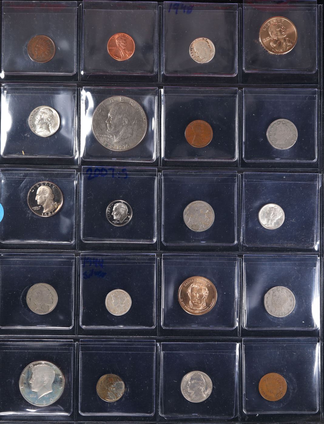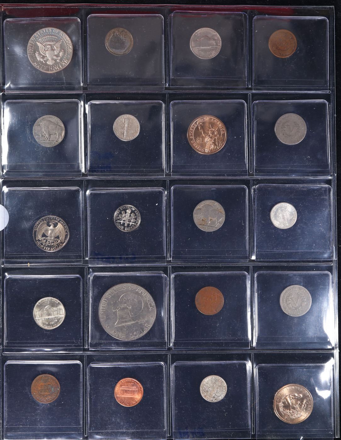 Huge Liifetime Collection - Too Many Coins To Auction Individually - This Lot is For One Page of 20 Coins - All US, No Foreign WOW!. We have received a huge collection of over 10 thousand US coins in flips, 2x2 holders, and 20 coin pages. We are forced, due to limited lots, to sell this collection in pages of 20 coins. All of the pages include Silver Coins. Most contain Indian Cents, Proof Coins, Barber Coinage, Bust Coinage, Lincoln Cents, Flying Eagles, Jefferson Nickels, Roosevelt Dimes, Buffalo Nickels, Eisenhower Dollars, Kennedy Halves, Large Cents including some Draped Bust Large Cents, Mercury Dimes, and Liberty V Nickels. These pages could not be reviewed by anyone in our office due to time constraints. We estimate the value of each page to meet or exceed $200 in value! Good luck and happy hunting.
