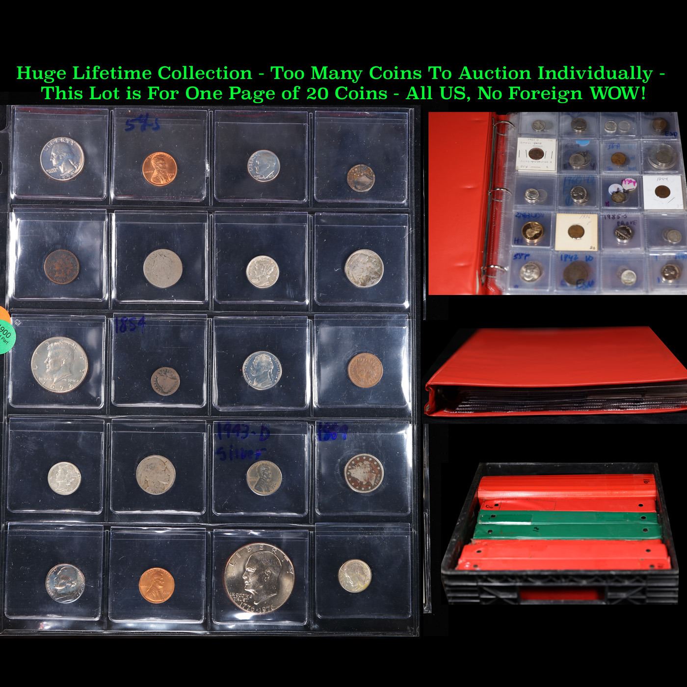 Huge Liifetime Collection - Too Many Coins To Auction Individually - This Lot is For One Page of 20 Coins - All US, No Foreign WOW!. We have received a huge collection of over 10 thousand US coins in flips, 2x2 holders, and 20 coin pages. We are forced, due to limited lots, to sell this collection in pages of 20 coins. All of the pages include Silver Coins. Most contain Indian Cents, Proof Coins, Barber Coinage, Bust Coinage, Lincoln Cents, Flying Eagles, Jefferson Nickels, Roosevelt Dimes, Buffalo Nickels, Eisenhower Dollars, Kennedy Halves, Large Cents including some Draped Bust Large Cents, Mercury Dimes, and Liberty V Nickels. These pages could not be reviewed by anyone in our office due to time constraints. We estimate the value of each page to meet or exceed $200 in value! Good luck and happy hunting.