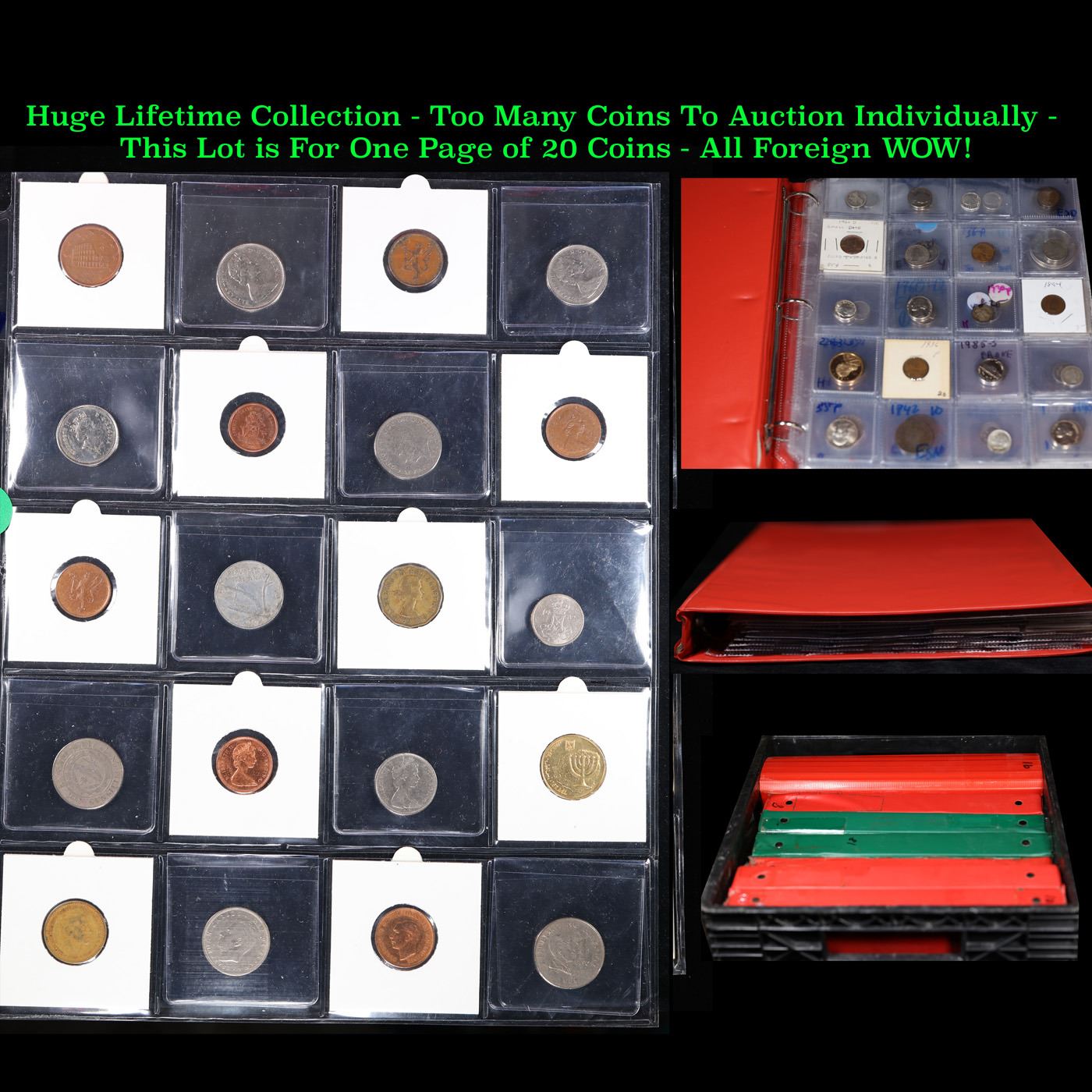Huge Liifetime Collection - Too Many Coins To Auction Individually - This Lot is For One Page of 20 Foreign Coins. We have received a huge collection of over 10 thousand US coins in flips, 2x2 holders, and 20 coin pages. We are forced, due to limited lots, to sell this collection in pages of 20 coins. All of the pages include Silver Coins. Most contain Indian Cents, Proof Coins, Barber Coinage, Bust Coinage, Lincoln Cents, Flying Eagles, Jefferson Nickels, Roosevelt Dimes, Buffalo Nickels, Eisenhower Dollars, Kennedy Halves, Large Cents including some Draped Bust Large Cents, Mercury Dimes, and Liberty V Nickels. These pages could not be reviewed by anyone in our office due to time constraints. We estimate the value of each page to meet or exceed $200 in value! Good luck and happy hunting.