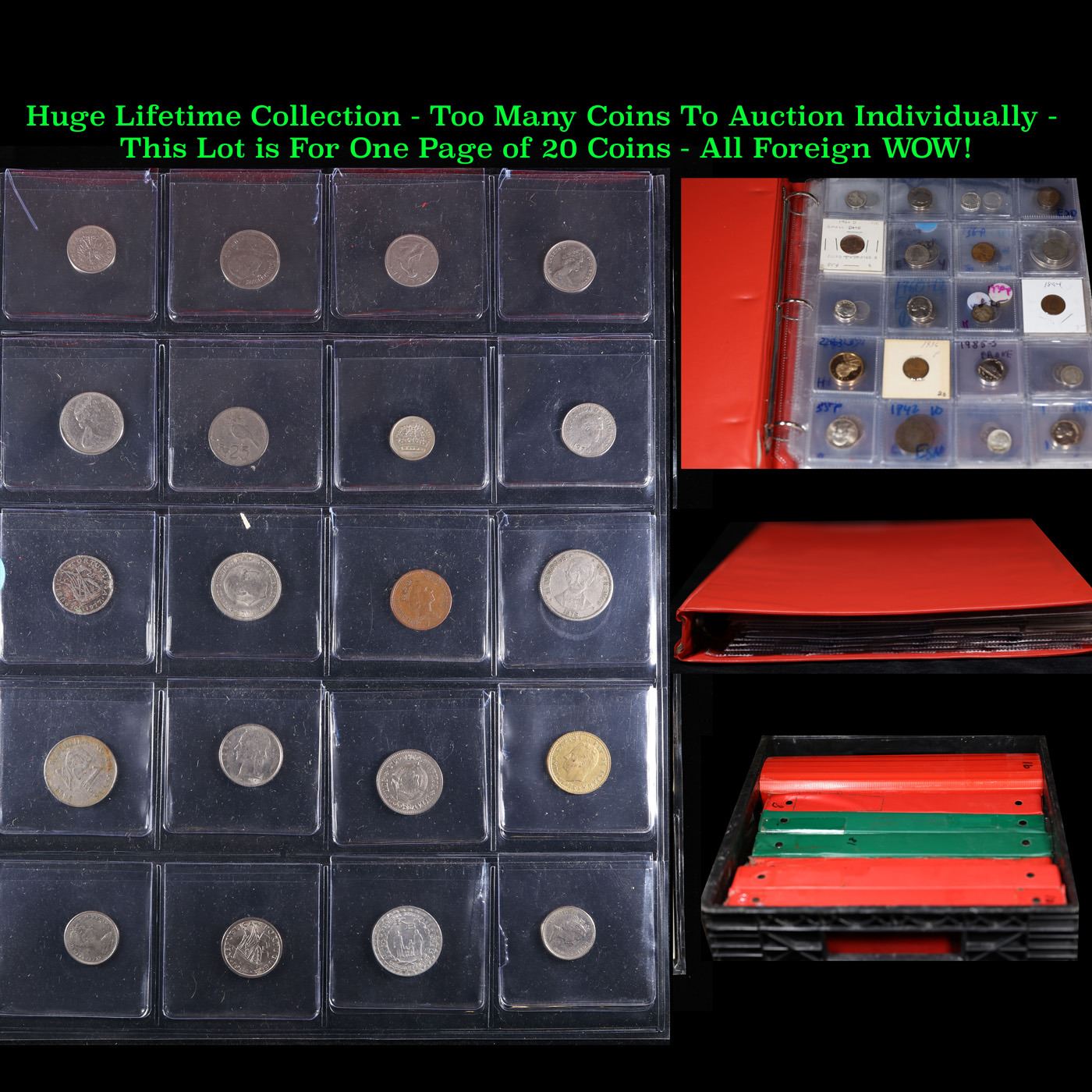 Huge Liifetime Collection - Too Many Coins To Auction Individually - This Lot is For One Page of 20 Foreign Coins. We have received a huge collection of over 10 thousand US coins in flips, 2x2 holders, and 20 coin pages. We are forced, due to limited lots, to sell this collection in pages of 20 coins. All of the pages include Silver Coins. Most contain Indian Cents, Proof Coins, Barber Coinage, Bust Coinage, Lincoln Cents, Flying Eagles, Jefferson Nickels, Roosevelt Dimes, Buffalo Nickels, Eisenhower Dollars, Kennedy Halves, Large Cents including some Draped Bust Large Cents, Mercury Dimes, and Liberty V Nickels. These pages could not be reviewed by anyone in our office due to time constraints. We estimate the value of each page to meet or exceed $200 in value! Good luck and happy hunting.