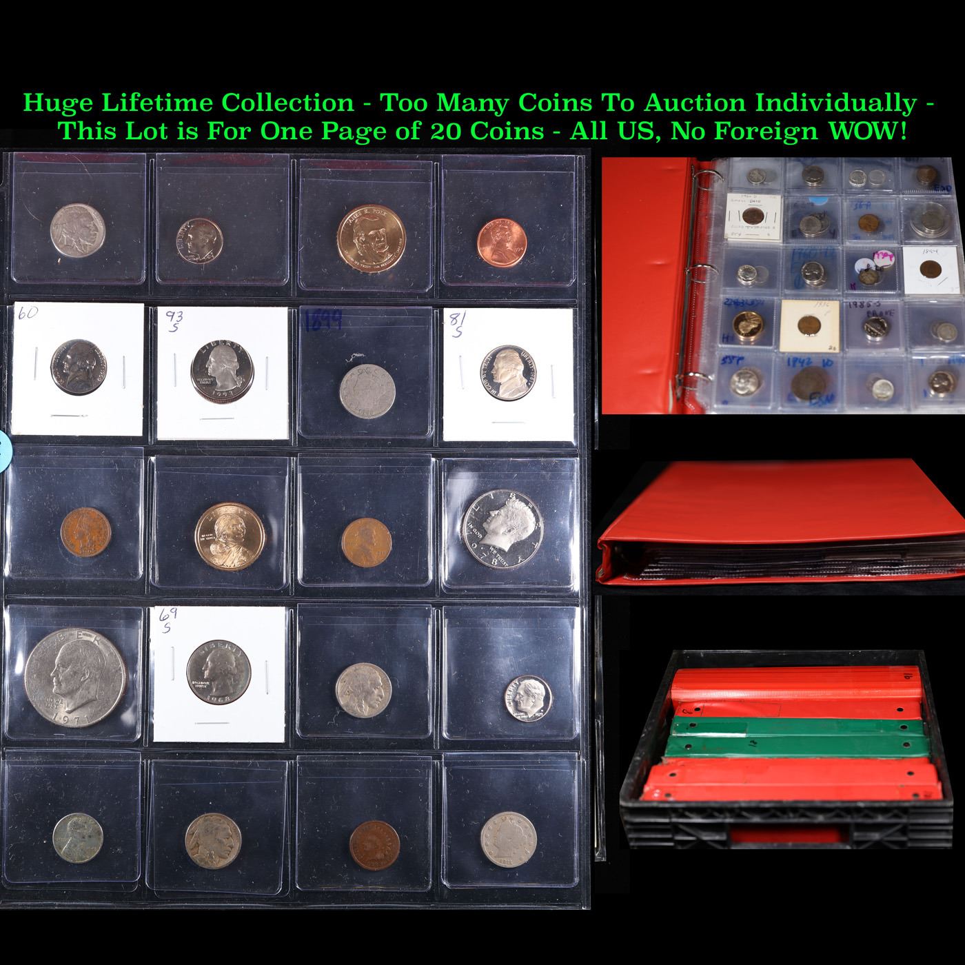 Huge Liifetime Collection - Too Many Coins To Auction Individually - This Lot is For One Page of 20 Coins - All US, No Foreign WOW!. We have received a huge collection of over 10 thousand US coins in flips, 2x2 holders, and 20 coin pages. We are forced, due to limited lots, to sell this collection in pages of 20 coins. All of the pages include Silver Coins. Most contain Indian Cents, Proof Coins, Barber Coinage, Bust Coinage, Lincoln Cents, Flying Eagles, Jefferson Nickels, Roosevelt Dimes, Buffalo Nickels, Eisenhower Dollars, Kennedy Halves, Large Cents including some Draped Bust Large Cents, Mercury Dimes, and Liberty V Nickels. These pages could not be reviewed by anyone in our office due to time constraints. We estimate the value of each page to meet or exceed $200 in value! Good luck and happy hunting.