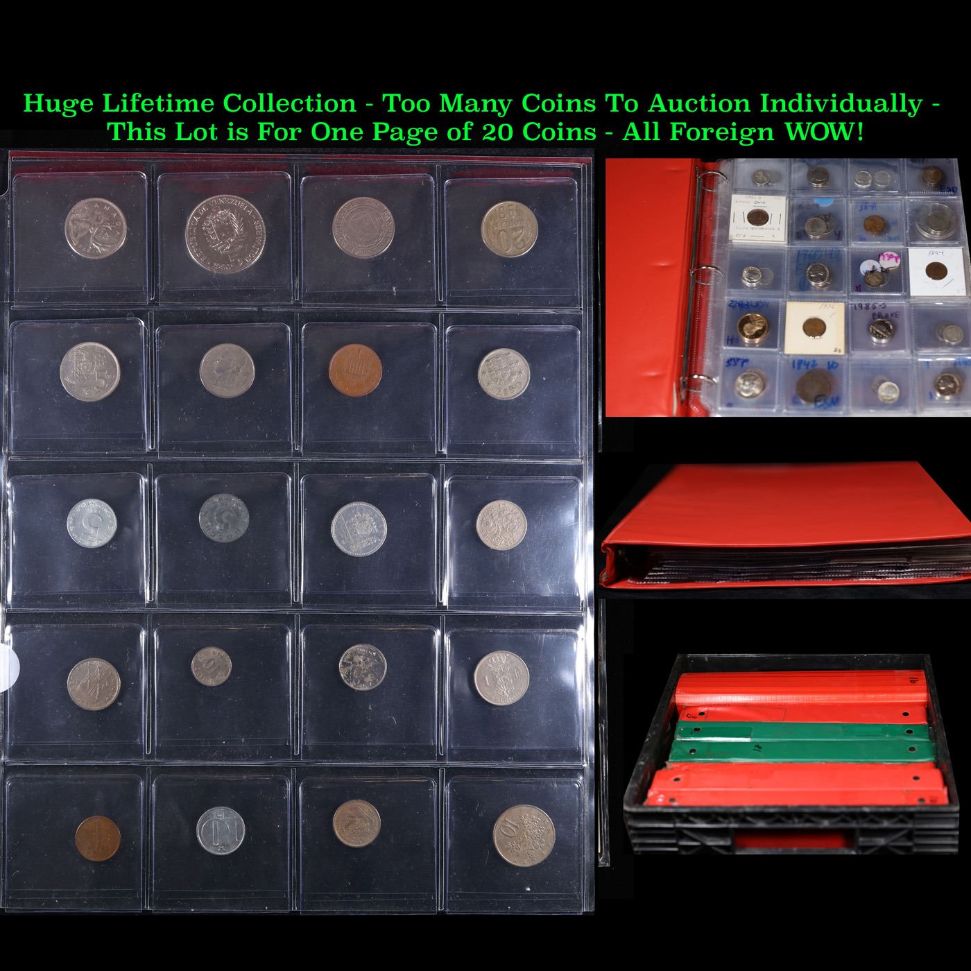 Huge Liifetime Collection - Too Many Coins To Auction Individually - This Lot is For One Page of 20 Foreign Coins. We have received a huge collection of over 10 thousand US coins in flips, 2x2 holders, and 20 coin pages. We are forced, due to limited lots, to sell this collection in pages of 20 coins. All of the pages include Silver Coins. Most contain Indian Cents, Proof Coins, Barber Coinage, Bust Coinage, Lincoln Cents, Flying Eagles, Jefferson Nickels, Roosevelt Dimes, Buffalo Nickels, Eisenhower Dollars, Kennedy Halves, Large Cents including some Draped Bust Large Cents, Mercury Dimes, and Liberty V Nickels. These pages could not be reviewed by anyone in our office due to time constraints. We estimate the value of each page to meet or exceed $200 in value! Good luck and happy hunting.