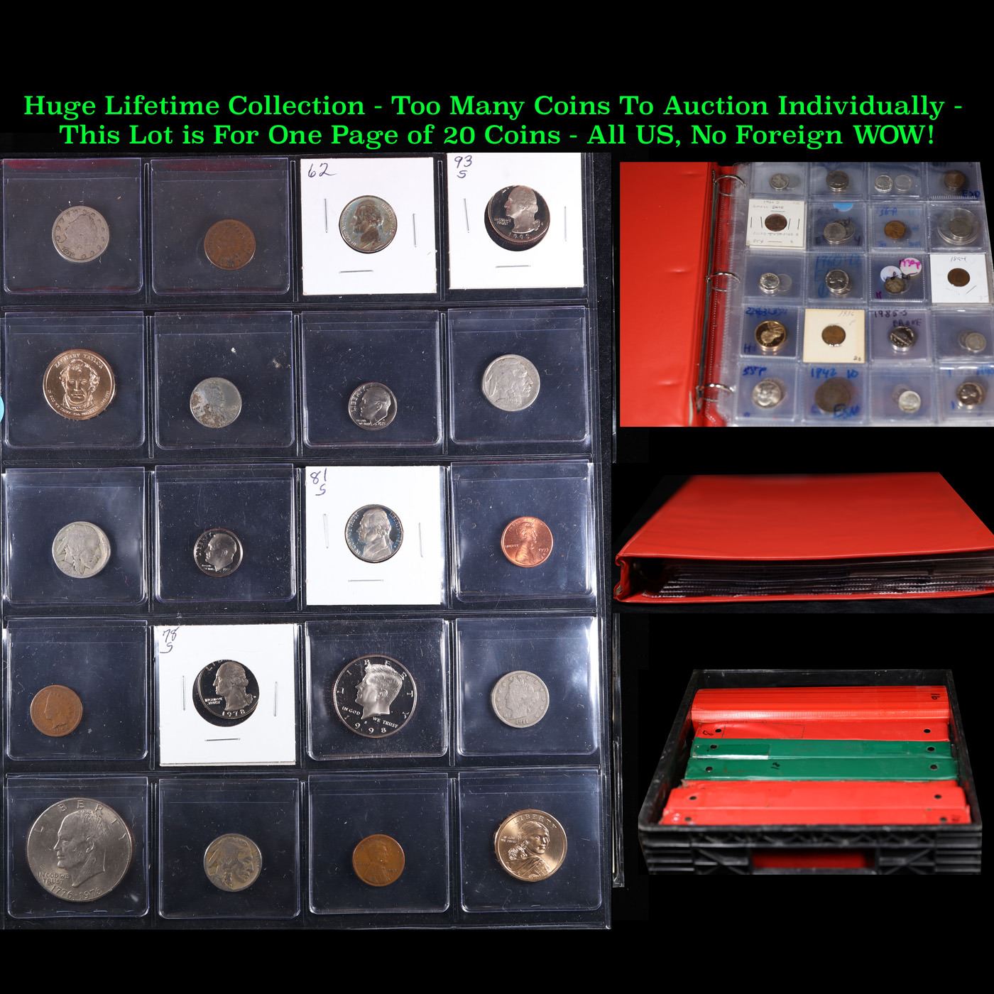 Huge Liifetime Collection - Too Many Coins To Auction Individually - This Lot is For One Page of 20 Coins - All US, No Foreign WOW!. We have received a huge collection of over 10 thousand US coins in flips, 2x2 holders, and 20 coin pages. We are forced, due to limited lots, to sell this collection in pages of 20 coins. All of the pages include Silver Coins. Most contain Indian Cents, Proof Coins, Barber Coinage, Bust Coinage, Lincoln Cents, Flying Eagles, Jefferson Nickels, Roosevelt Dimes, Buffalo Nickels, Eisenhower Dollars, Kennedy Halves, Large Cents including some Draped Bust Large Cents, Mercury Dimes, and Liberty V Nickels. These pages could not be reviewed by anyone in our office due to time constraints. We estimate the value of each page to meet or exceed $200 in value! Good luck and happy hunting.