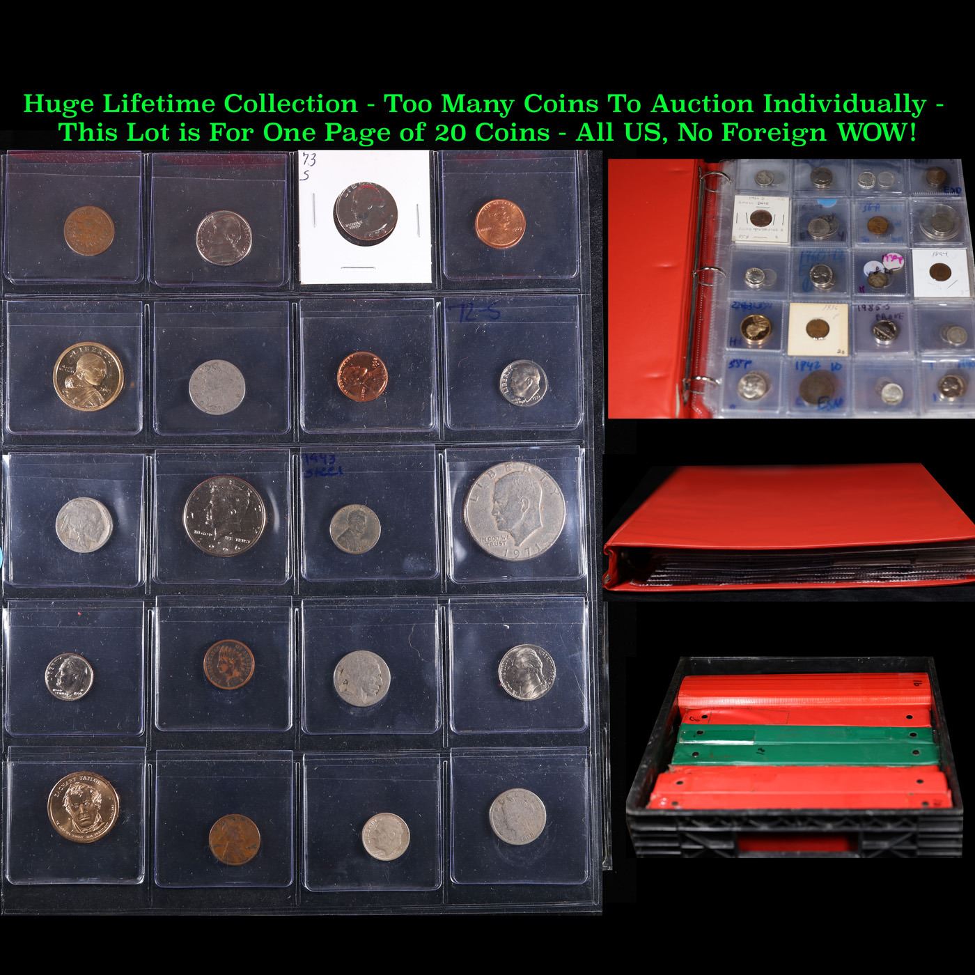 Huge Liifetime Collection - Too Many Coins To Auction Individually - This Lot is For One Page of 20 Coins - All US, No Foreign WOW!. We have received a huge collection of over 10 thousand US coins in flips, 2x2 holders, and 20 coin pages. We are forced, due to limited lots, to sell this collection in pages of 20 coins. All of the pages include Silver Coins. Most contain Indian Cents, Proof Coins, Barber Coinage, Bust Coinage, Lincoln Cents, Flying Eagles, Jefferson Nickels, Roosevelt Dimes, Buffalo Nickels, Eisenhower Dollars, Kennedy Halves, Large Cents including some Draped Bust Large Cents, Mercury Dimes, and Liberty V Nickels. These pages could not be reviewed by anyone in our office due to time constraints. We estimate the value of each page to meet or exceed $200 in value! Good luck and happy hunting.