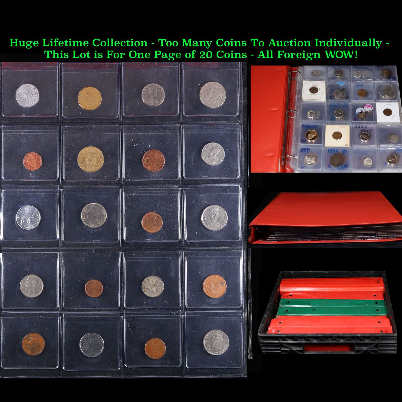 Huge Liifetime Collection - Too Many Coins To Auction Individually - This Lot is For One Page of 20 Foreign Coins. We have received a huge collection of over 10 thousand US coins in flips, 2x2 holders, and 20 coin pages. We are forced, due to limited lots, to sell this collection in pages of 20 coins. All of the pages include Silver Coins. Most contain Indian Cents, Proof Coins, Barber Coinage, Bust Coinage, Lincoln Cents, Flying Eagles, Jefferson Nickels, Roosevelt Dimes, Buffalo Nickels, Eisenhower Dollars, Kennedy Halves, Large Cents including some Draped Bust Large Cents, Mercury Dimes, and Liberty V Nickels. These pages could not be reviewed by anyone in our office due to time constraints. We estimate the value of each page to meet or exceed $200 in value! Good luck and happy hunting.