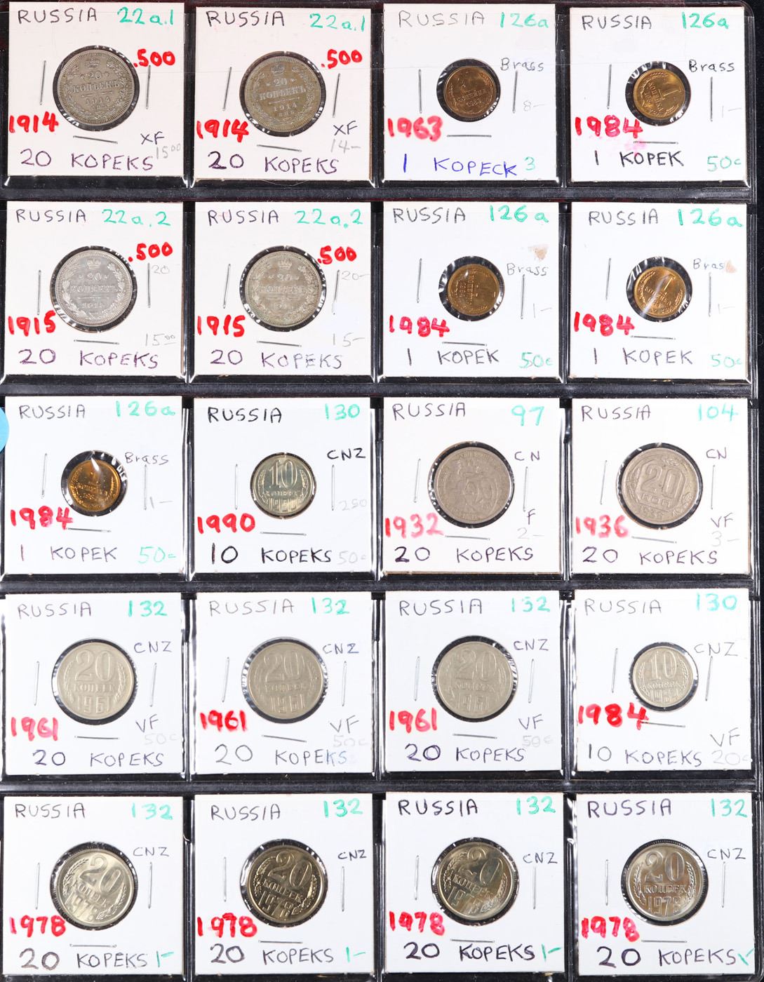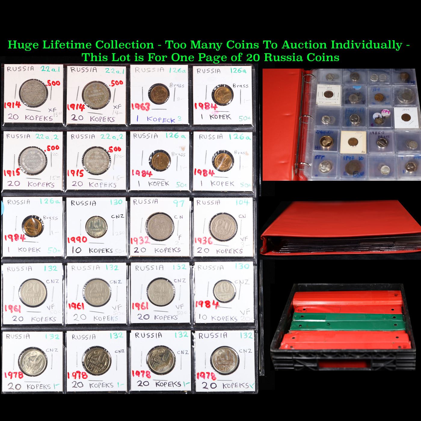 Huge Liifetime Collection - Too Many Coins To Auction Individually - This Lot is For One Page of 20 Russia Coins. We have received a huge collection of over 10 thousand US coins in flips, 2x2 holders, and 20 coin pages. We are forced, due to limited lots, to sell this collection in pages of 20 coins. All of the pages include Silver Coins. Most contain Indian Cents, Proof Coins, Barber Coinage, Bust Coinage, Lincoln Cents, Flying Eagles, Jefferson Nickels, Roosevelt Dimes, Buffalo Nickels, Eisenhower Dollars, Kennedy Halves, Large Cents including some Draped Bust Large Cents, Mercury Dimes, and Liberty V Nickels. These pages could not be reviewed by anyone in our office due to time constraints. We estimate the value of each page to meet or exceed $200 in value! Good luck and happy hunting.