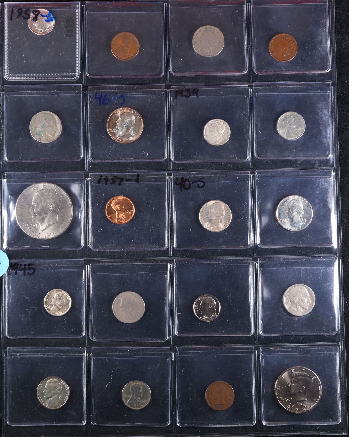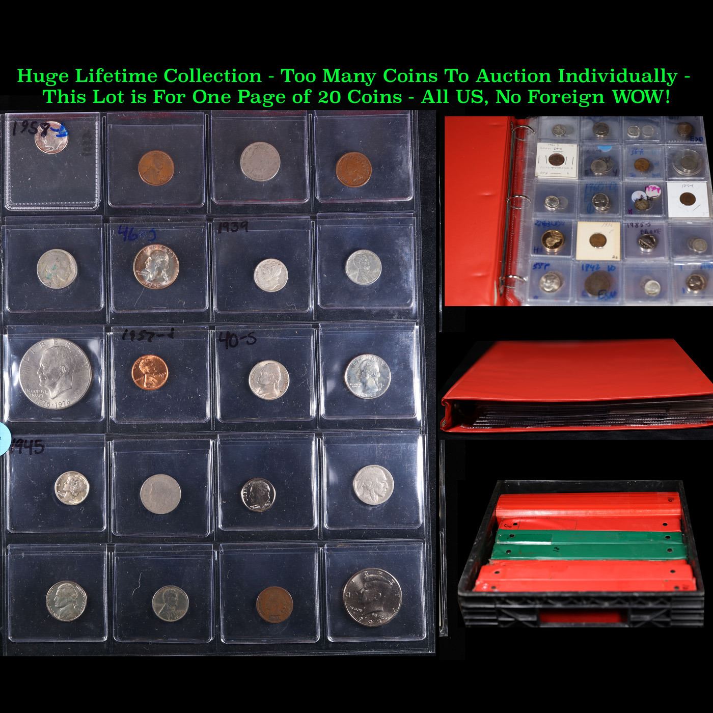 Huge Liifetime Collection - Too Many Coins To Auction Individually - This Lot is For One Page of 20 Coins - All US, No Foreign WOW!. We have received a huge collection of over 10 thousand US coins in flips, 2x2 holders, and 20 coin pages. We are forced, due to limited lots, to sell this collection in pages of 20 coins. All of the pages include Silver Coins. Most contain Indian Cents, Proof Coins, Barber Coinage, Bust Coinage, Lincoln Cents, Flying Eagles, Jefferson Nickels, Roosevelt Dimes, Buffalo Nickels, Eisenhower Dollars, Kennedy Halves, Large Cents including some Draped Bust Large Cents, Mercury Dimes, and Liberty V Nickels. These pages could not be reviewed by anyone in our office due to time constraints. We estimate the value of each page to meet or exceed $200 in value! Good luck and happy hunting.