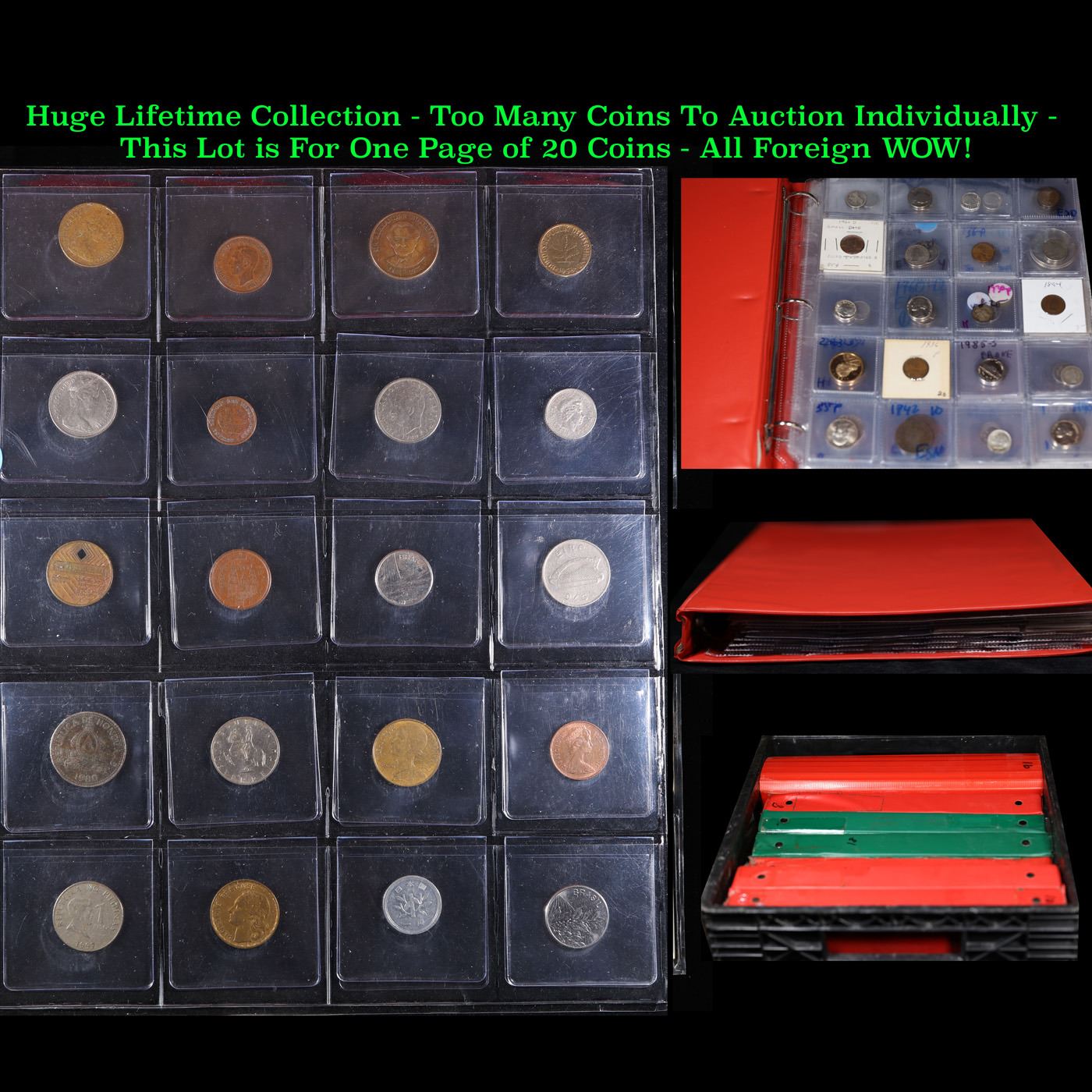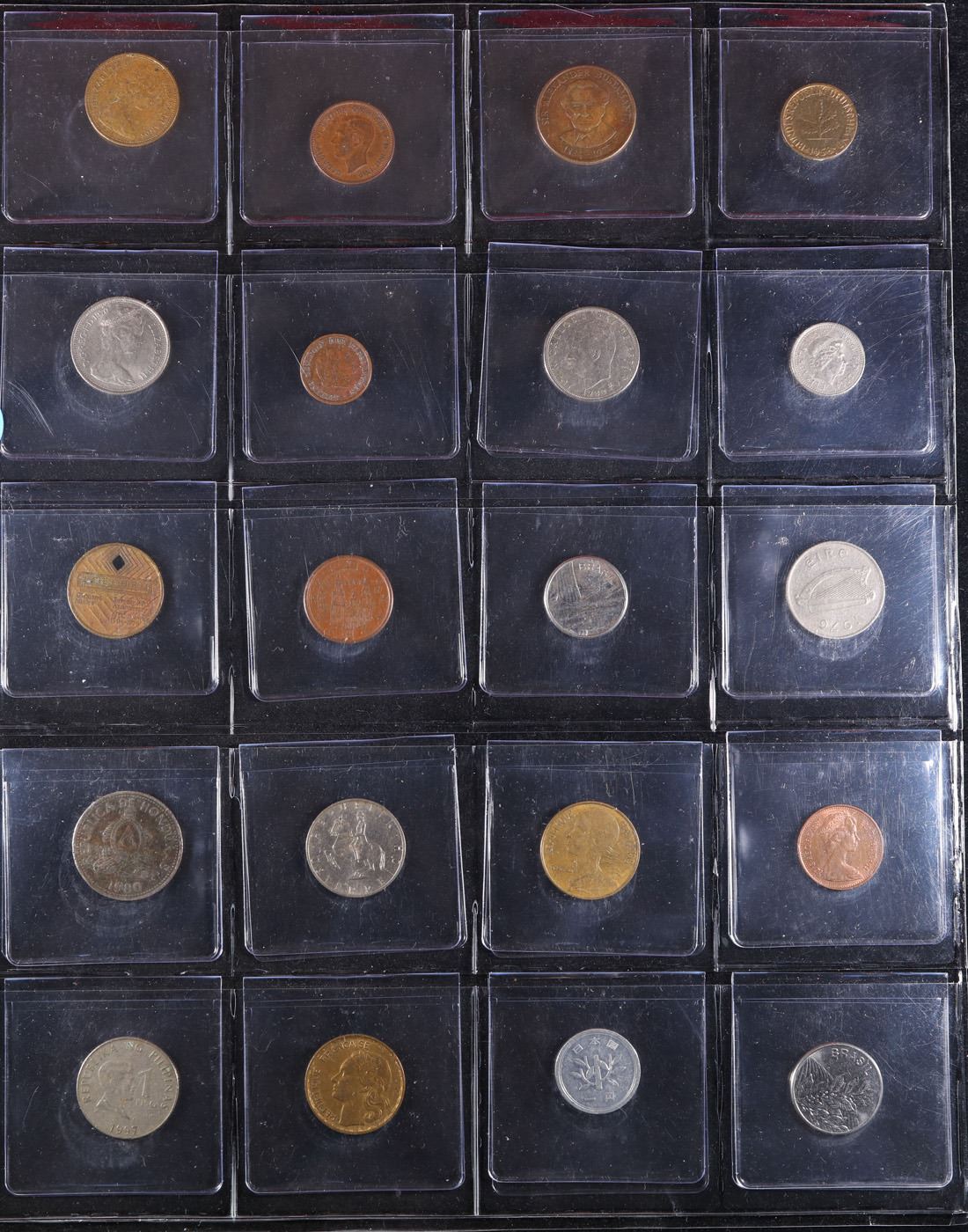 Huge Liifetime Collection - Too Many Coins To Auction Individually - This Lot is For One Page of 20 Foreign Coins. We have received a huge collection of over 10 thousand US coins in flips, 2x2 holders, and 20 coin pages. We are forced, due to limited lots, to sell this collection in pages of 20 coins. All of the pages include Silver Coins. Most contain Indian Cents, Proof Coins, Barber Coinage, Bust Coinage, Lincoln Cents, Flying Eagles, Jefferson Nickels, Roosevelt Dimes, Buffalo Nickels, Eisenhower Dollars, Kennedy Halves, Large Cents including some Draped Bust Large Cents, Mercury Dimes, and Liberty V Nickels. These pages could not be reviewed by anyone in our office due to time constraints. We estimate the value of each page to meet or exceed $200 in value! Good luck and happy hunting.