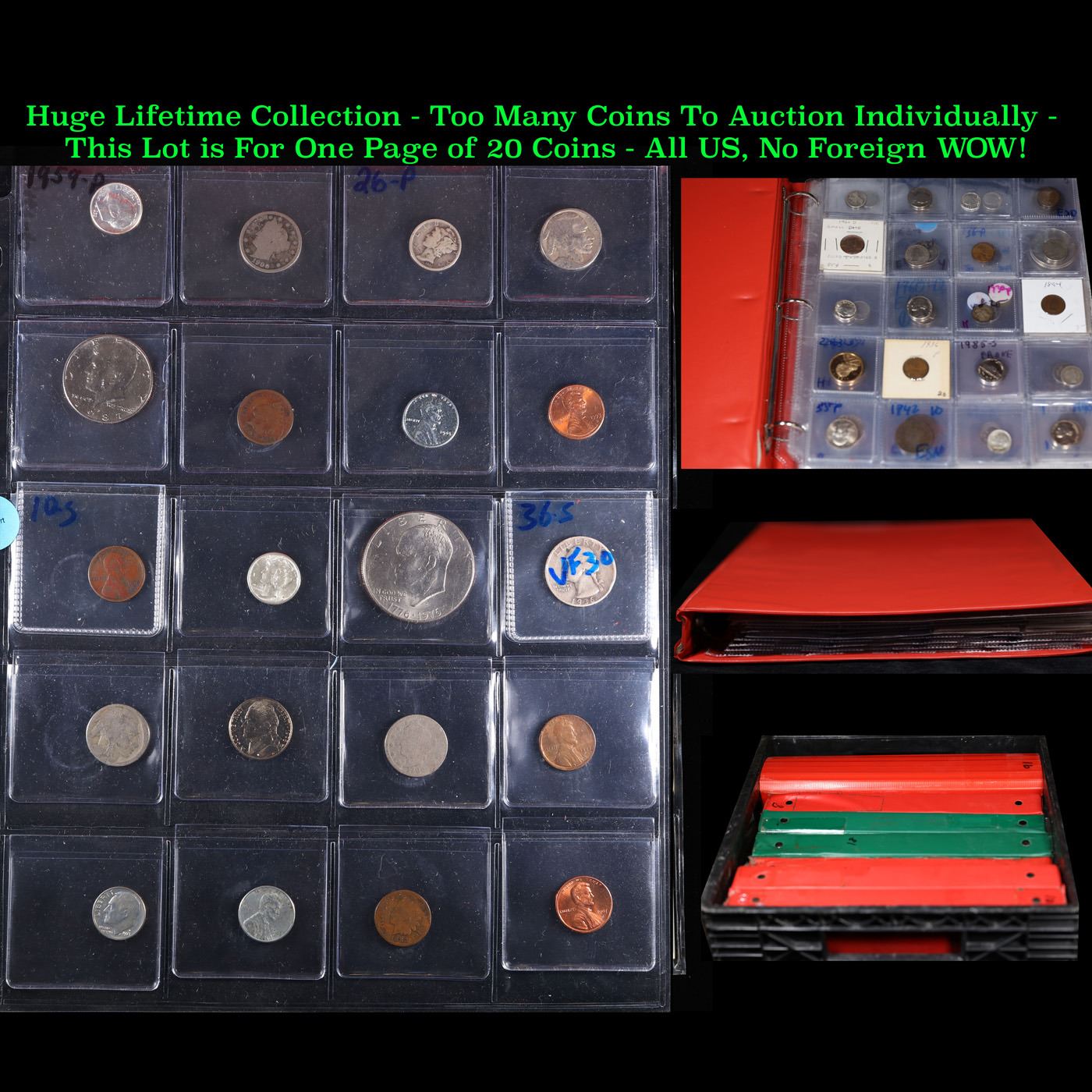 Huge Liifetime Collection - Too Many Coins To Auction Individually - This Lot is For One Page of 20 Coins - All US, No Foreign WOW!. We have received a huge collection of over 10 thousand US coins in flips, 2x2 holders, and 20 coin pages. We are forced, due to limited lots, to sell this collection in pages of 20 coins. All of the pages include Silver Coins. Most contain Indian Cents, Proof Coins, Barber Coinage, Bust Coinage, Lincoln Cents, Flying Eagles, Jefferson Nickels, Roosevelt Dimes, Buffalo Nickels, Eisenhower Dollars, Kennedy Halves, Large Cents including some Draped Bust Large Cents, Mercury Dimes, and Liberty V Nickels. These pages could not be reviewed by anyone in our office due to time constraints. We estimate the value of each page to meet or exceed $200 in value! Good luck and happy hunting.
